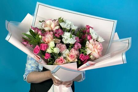 Альстромерия - 4 шт. Лента - 1 шт. Лизиантус - 1 шт. Роза кустовая - 3 шт. Диантус - 3 шт. Фисташка - 3 шт. Хризантема Балтика - 4 шт. Роза Эсперанса - 3 шт. Пленка матовая - 1 шт. пленка лист - 4 шт. роза кения топ гир - 3 шт.
