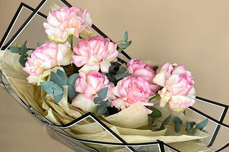 Эвкалипт - 1 шт. Лента атласная - 1 шт. Тишью - 4 шт. Пленка - 5 шт. Роза Эсперанса - 7 шт.