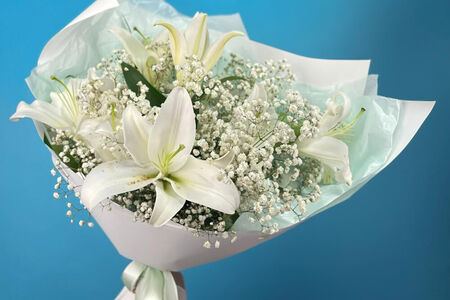 Гипсофила - 3 шт. Лента - 1 шт. Лилия - 3 шт. Пленка матовая - 2 шт.