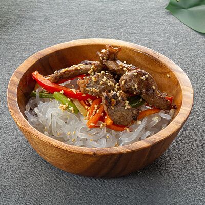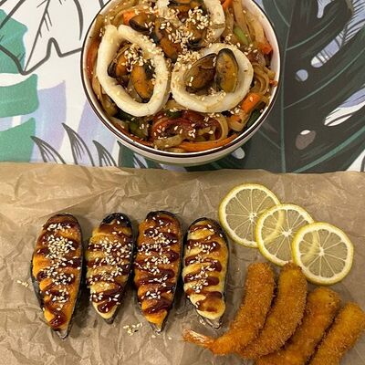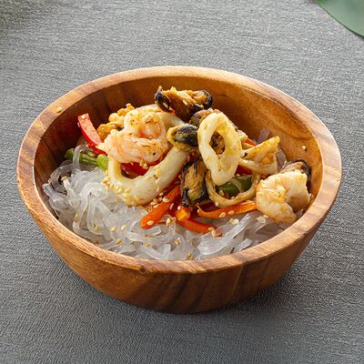 Мидии, креветка, кальмар, перец болгарский, лук, фасоль стручковая, морковь, пшеничная лапша