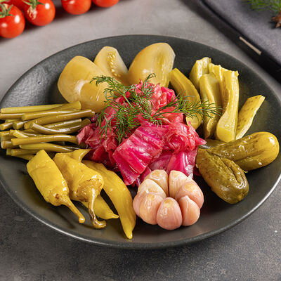 Помидоры, огурцы, перец маринованный, чеснок, капуста гурийская