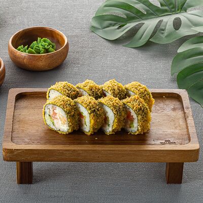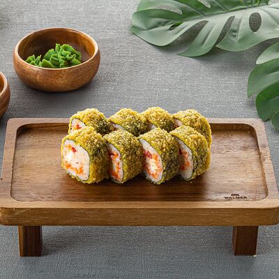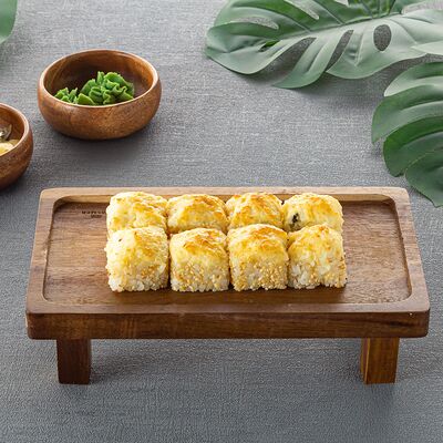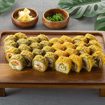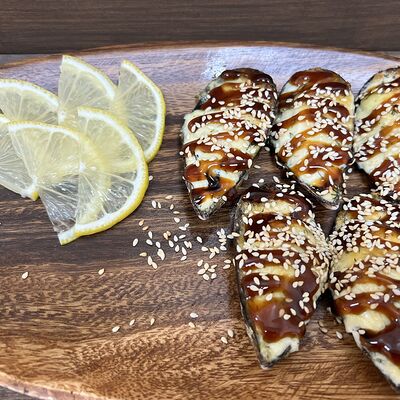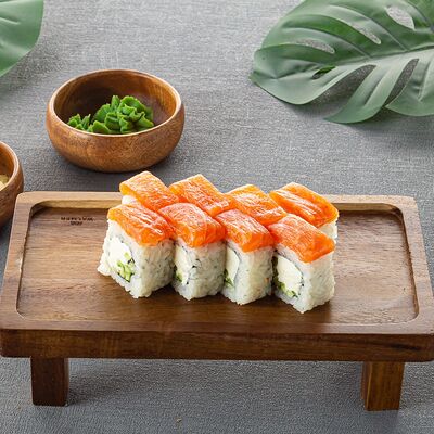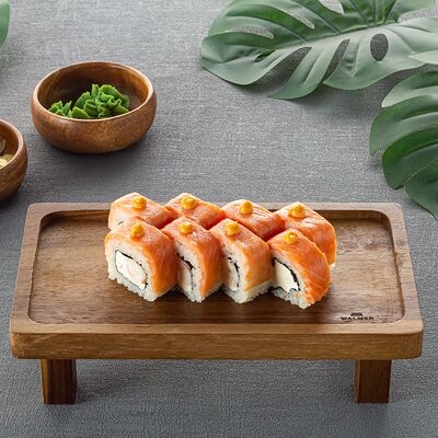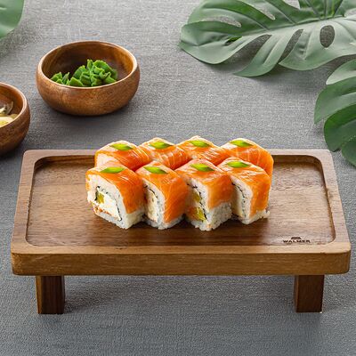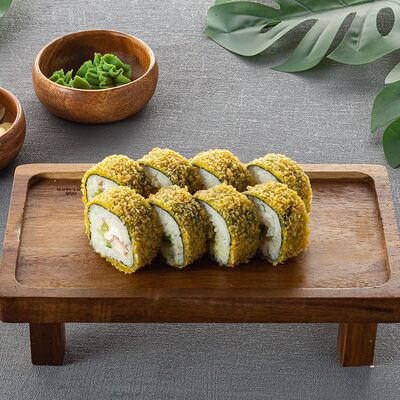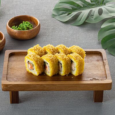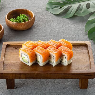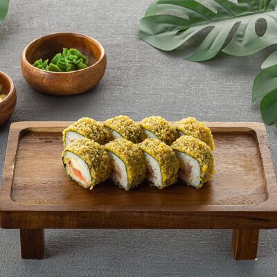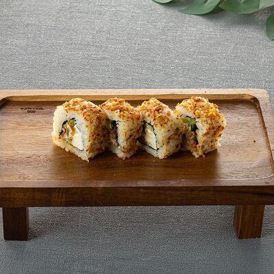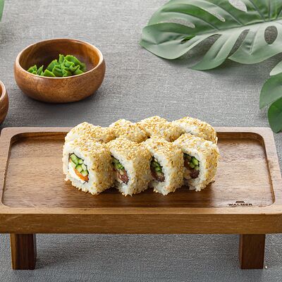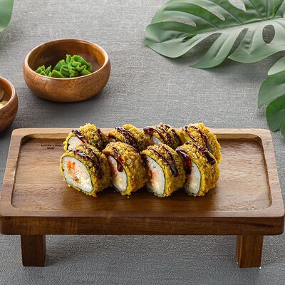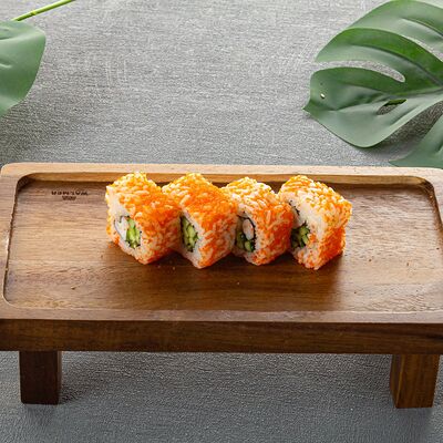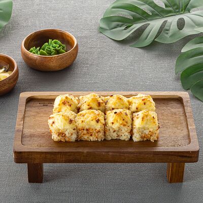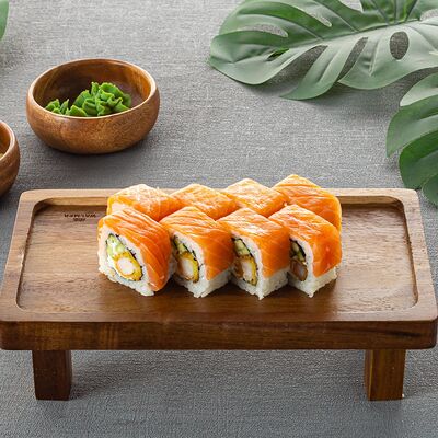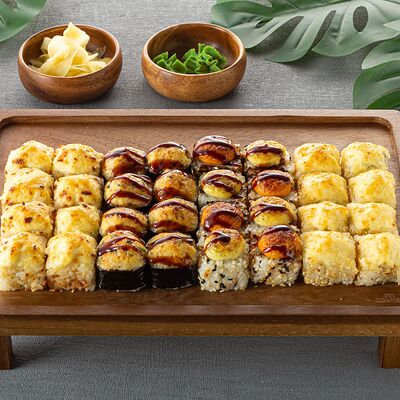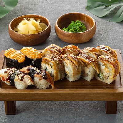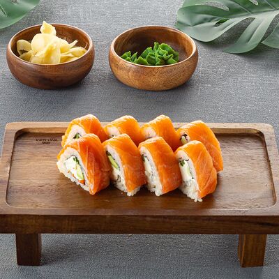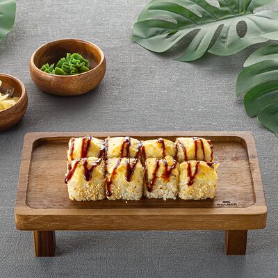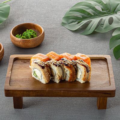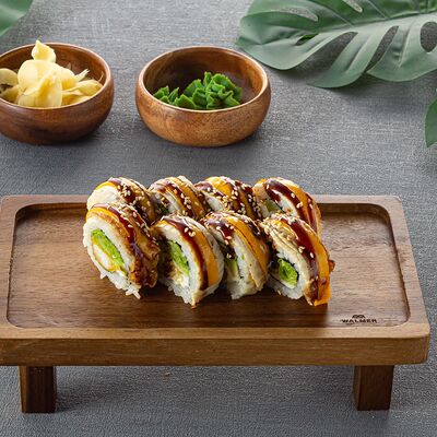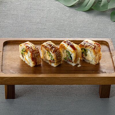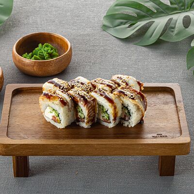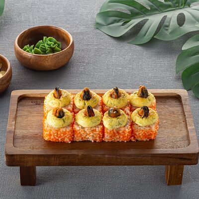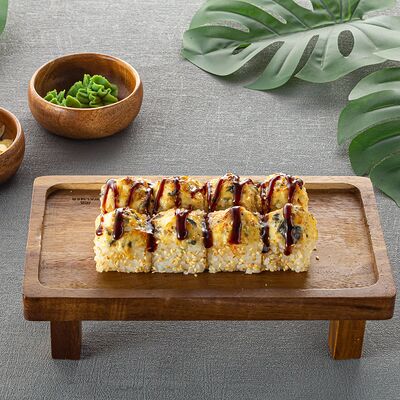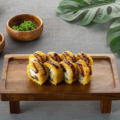 Творожный сыр, копченый угорь, хрустящий огурчик, сырный соус, соус унаги, водоросли нори, рис в обсыпке кунжута (8 шт.). Соевый соус, имбирь и васаби в комплект не входят