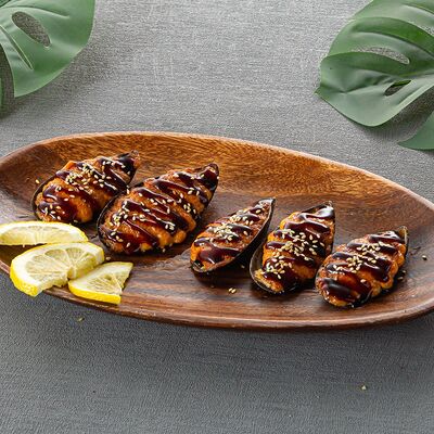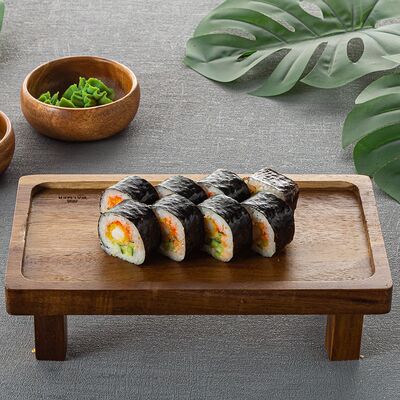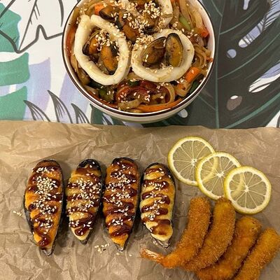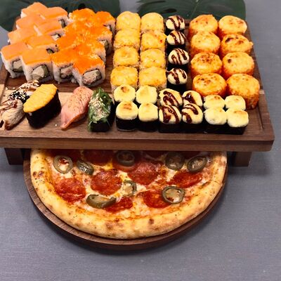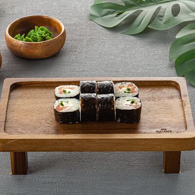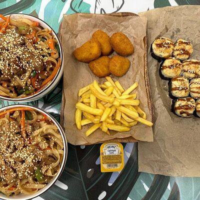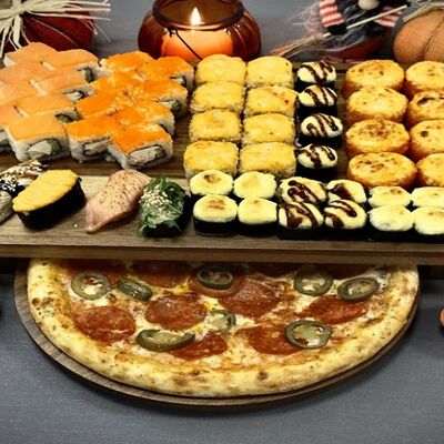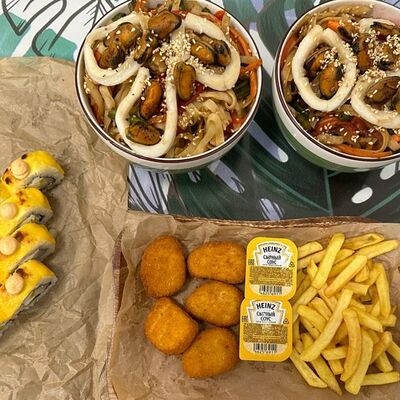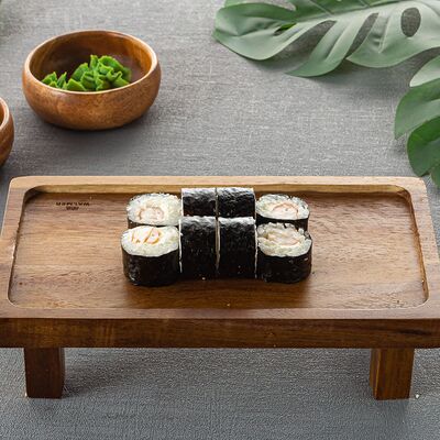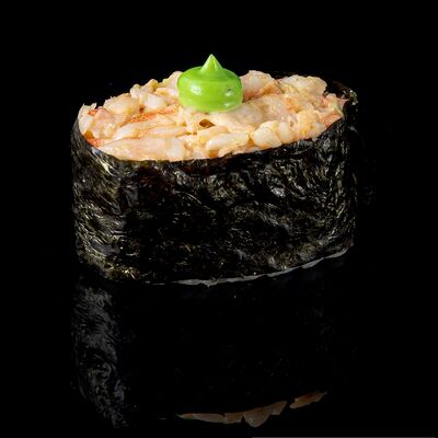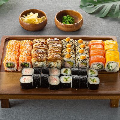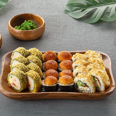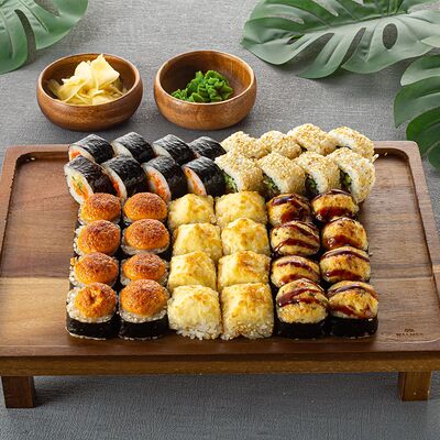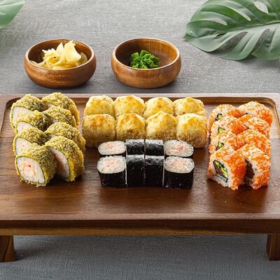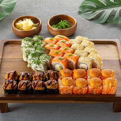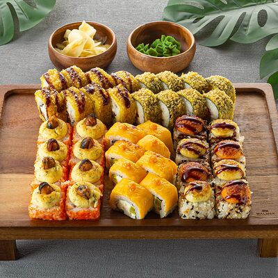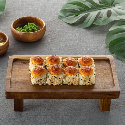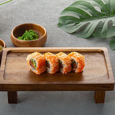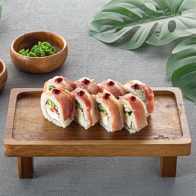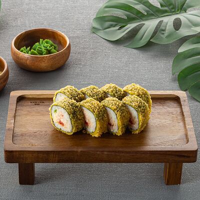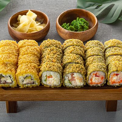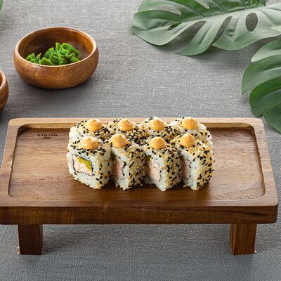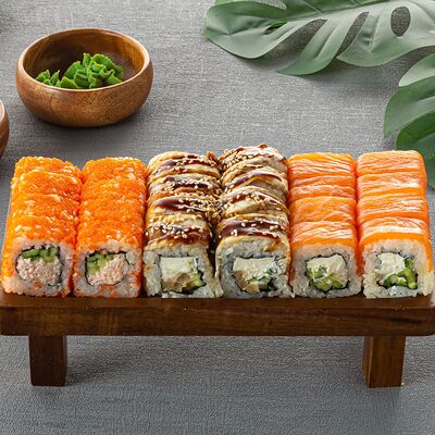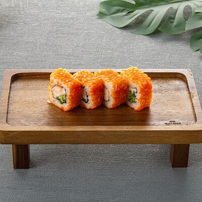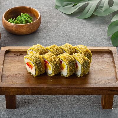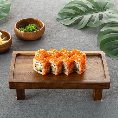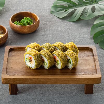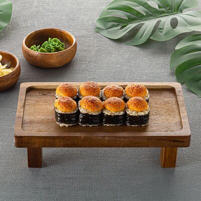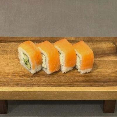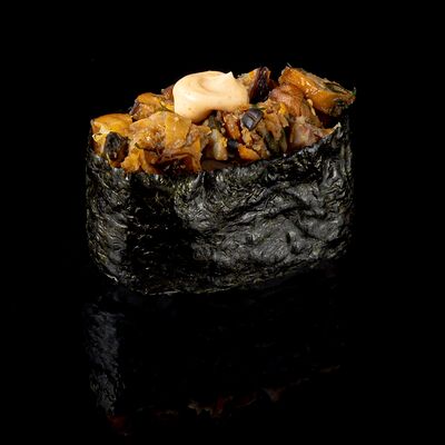 Творожный сыр, копченый угорь, хрустящий огурчик, сырный соус, соус унаги, водоросли нори, рис в обсыпке кунжута (8 шт.). Соевый соус, имбирь и васаби в комплект не входят