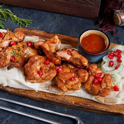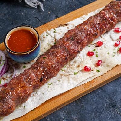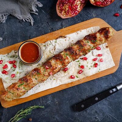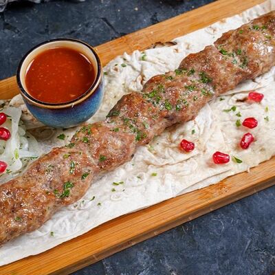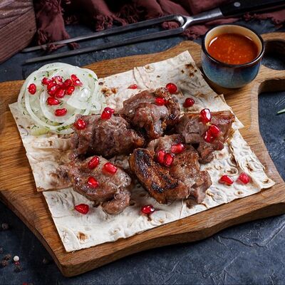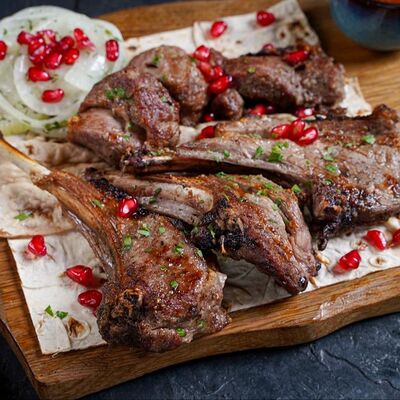 Филе каре ягненка на кости с лавашом, маринованным луком и шашлычным соусом