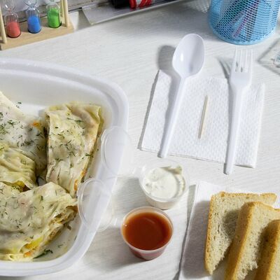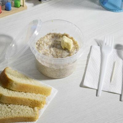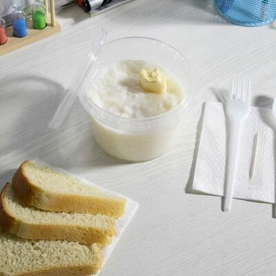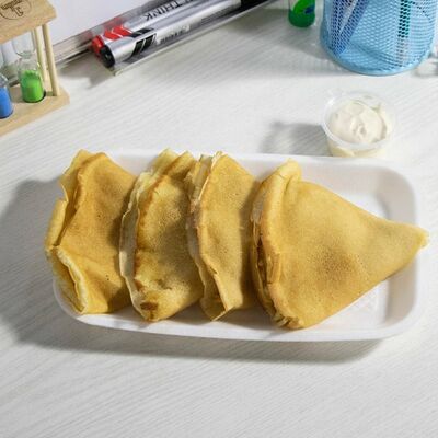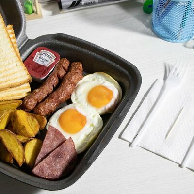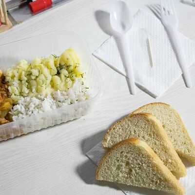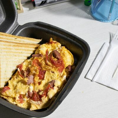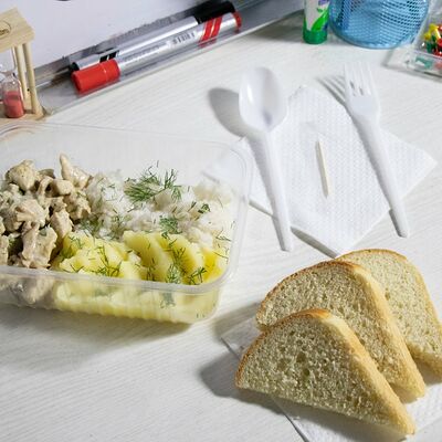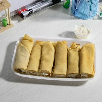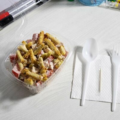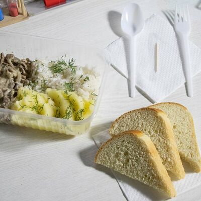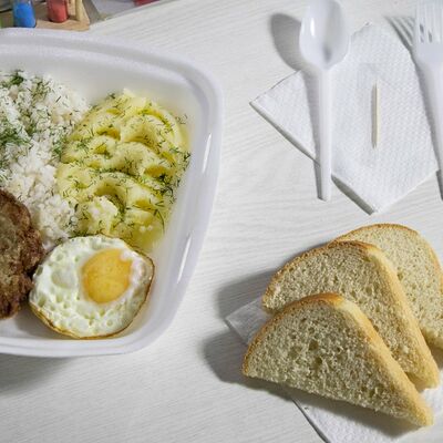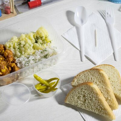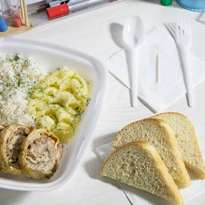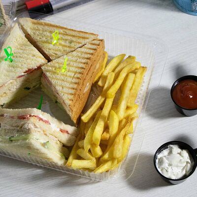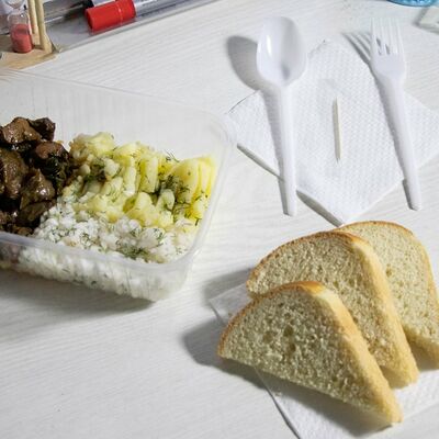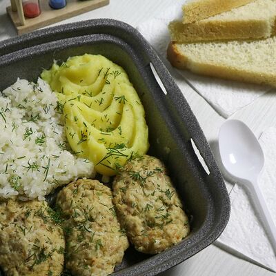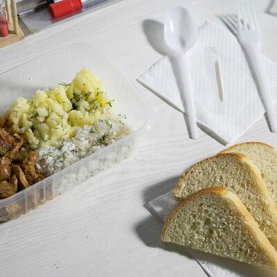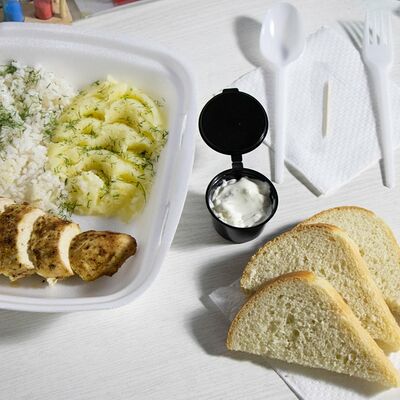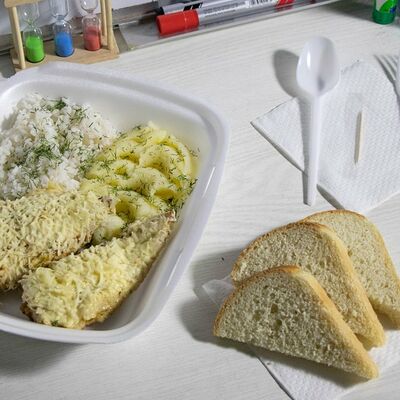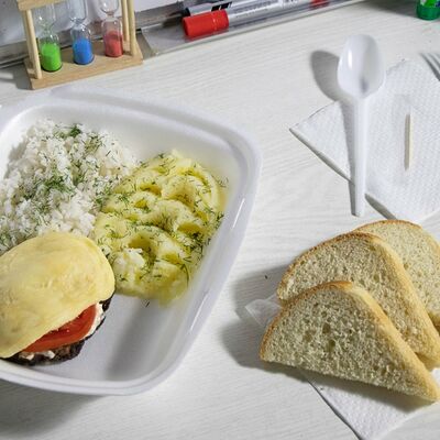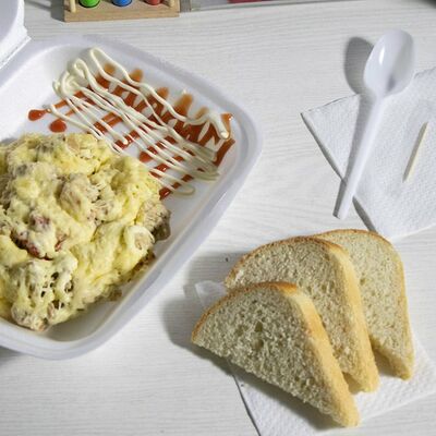 Нежное куриное филе, запечённый картофель, маринованные грибочки, сливочный сыр, красный помидор, майонез провансаль