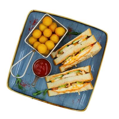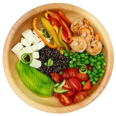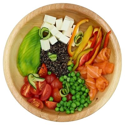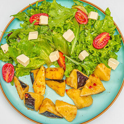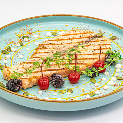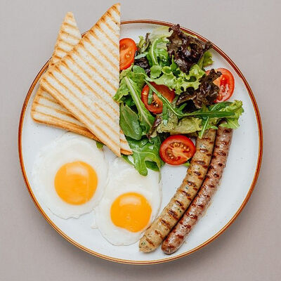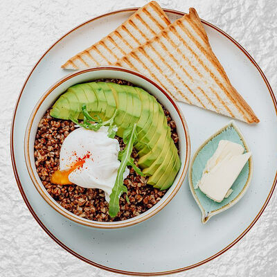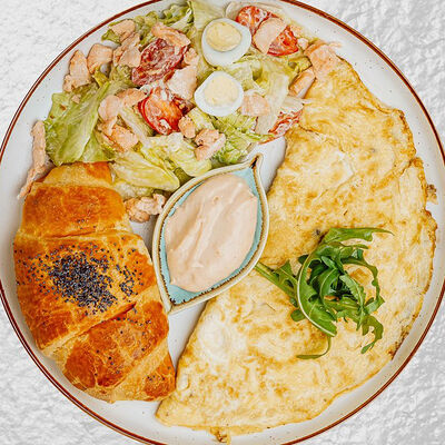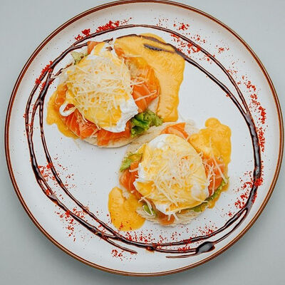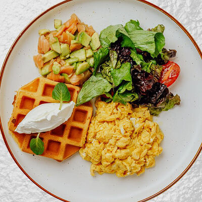 Сытный завтрак с вафлей, тартаром из лосося и скрамблом из двух яиц