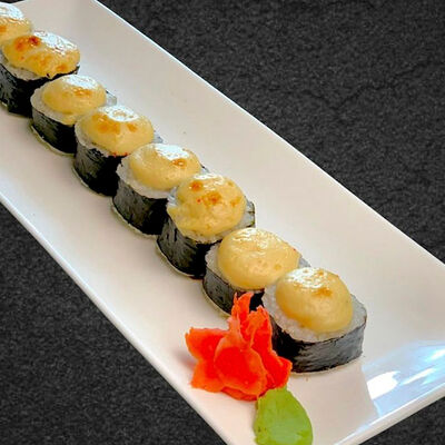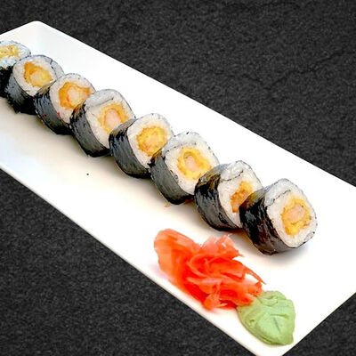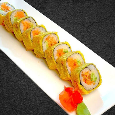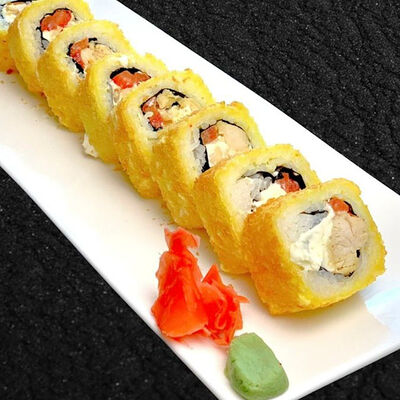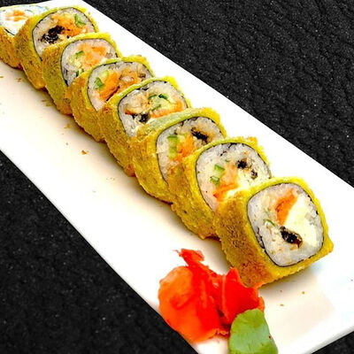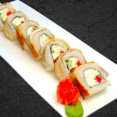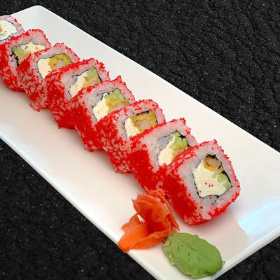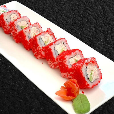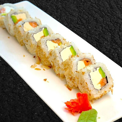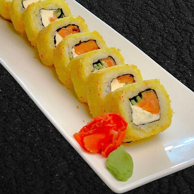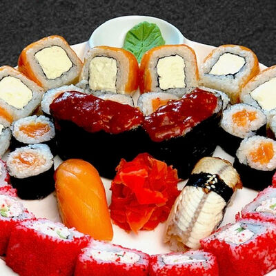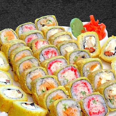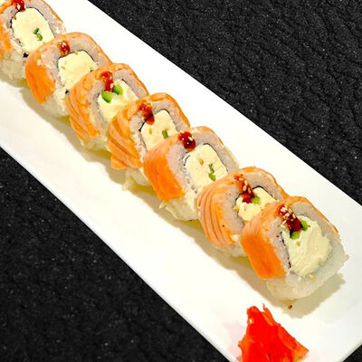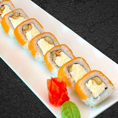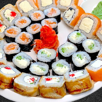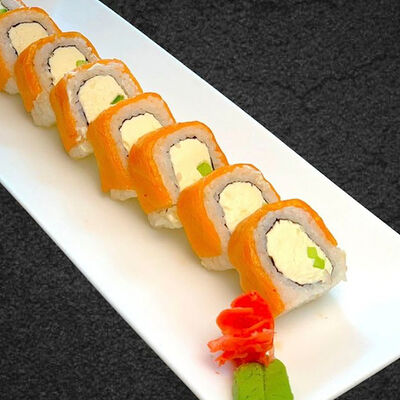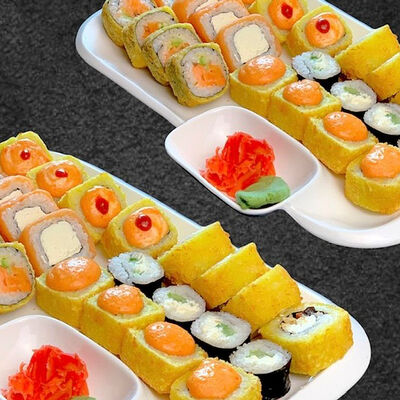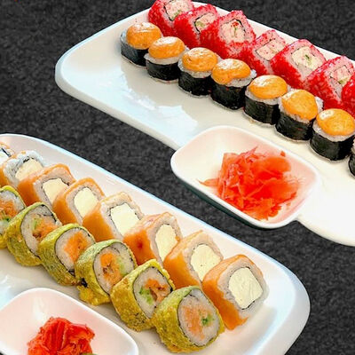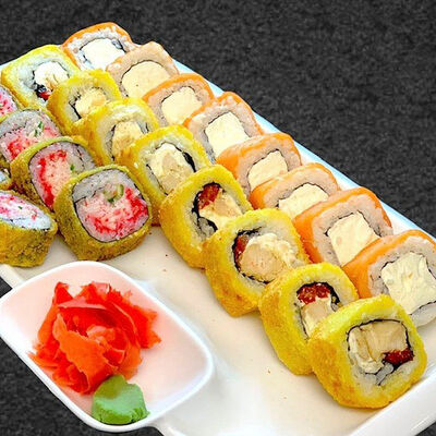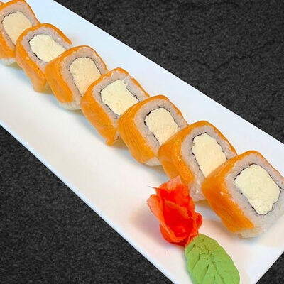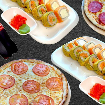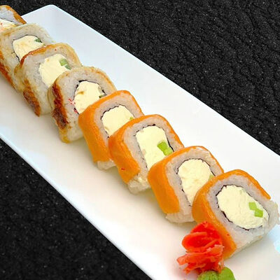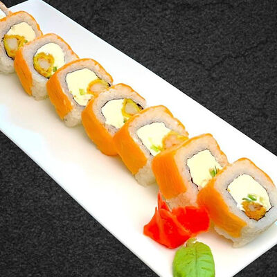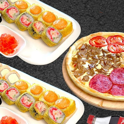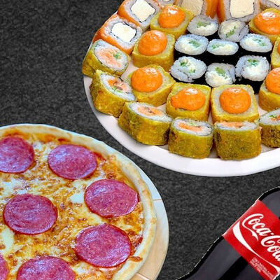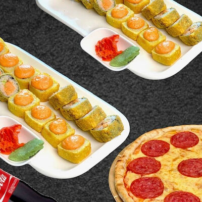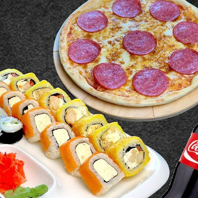 Филадельфия маки (8 шт.), сяке темпура (8 шт.), запеченный цезарь (8 шт.), каппа маки (8 шт.), салями (6 шт.), coca-cola (1 л)