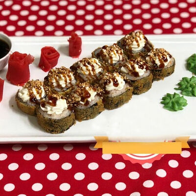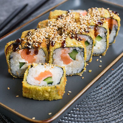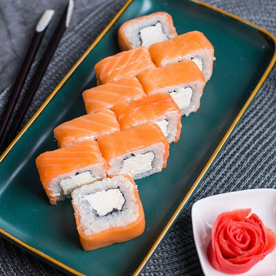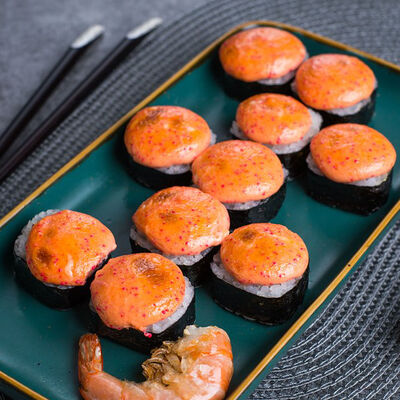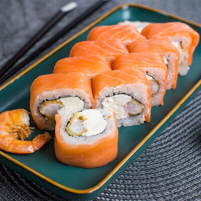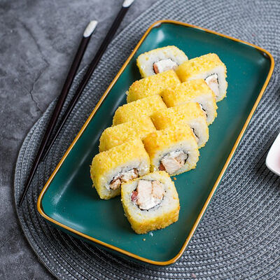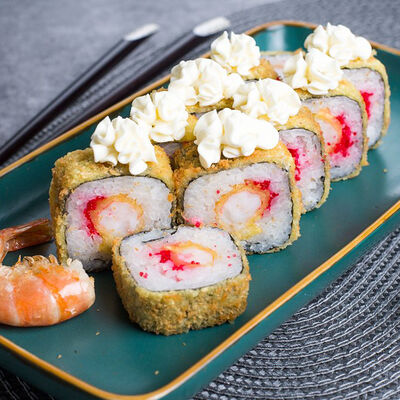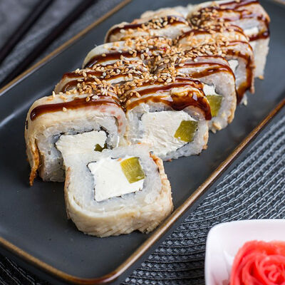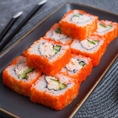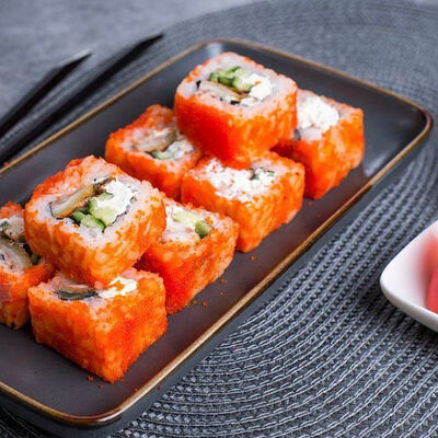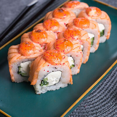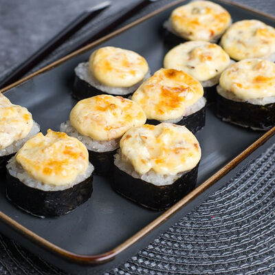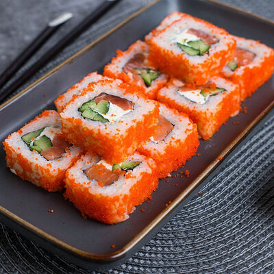 Крабовые палочки, сыр творожный, огурец, тобико, рис, нори, сыр моцарелла