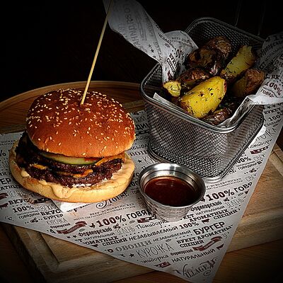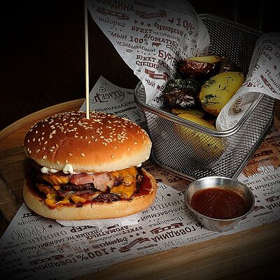 Булочка бриош, испеченная в немецкой печи,3 котлеты из мраморной говядины black angus, фирменный соус, свежий красный лук, маринованные огурчики, сыр, фирменный томатный и горчичный соус