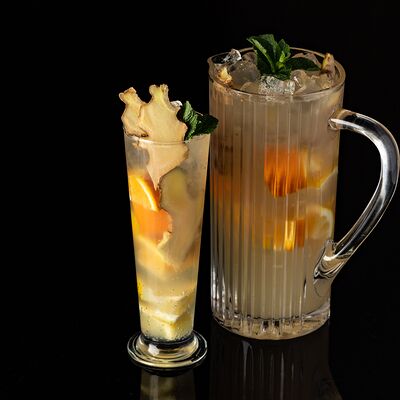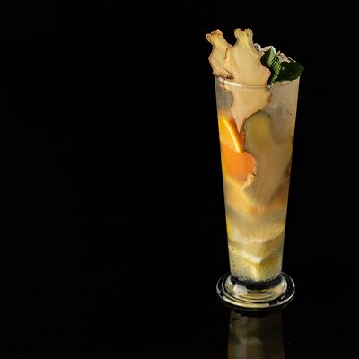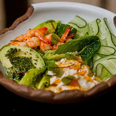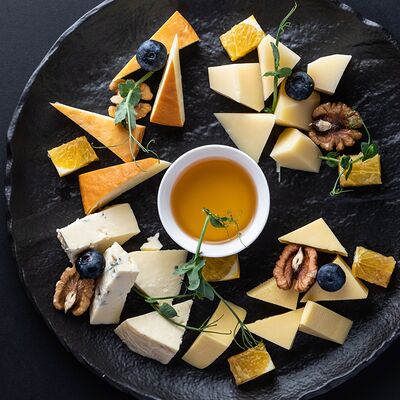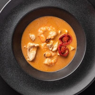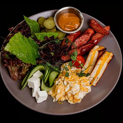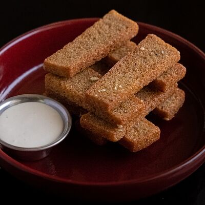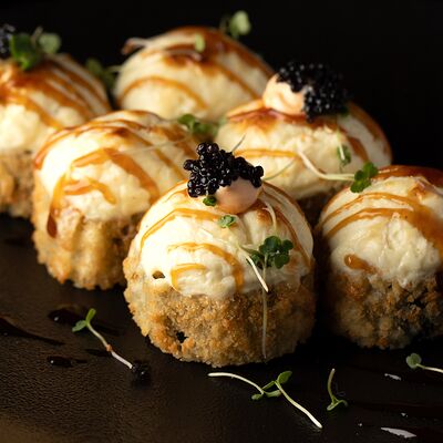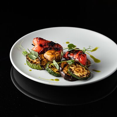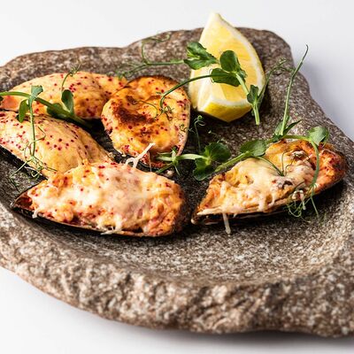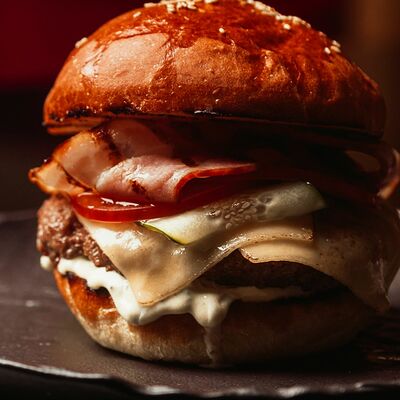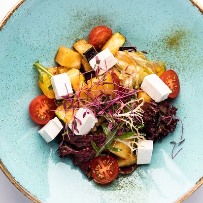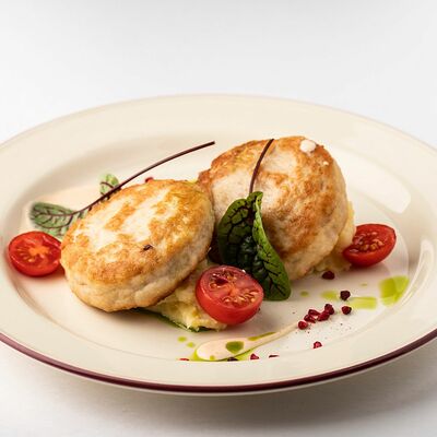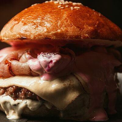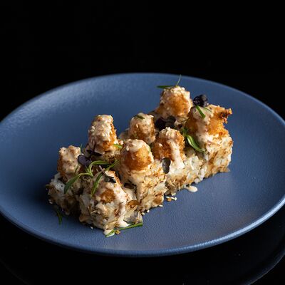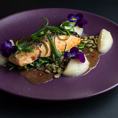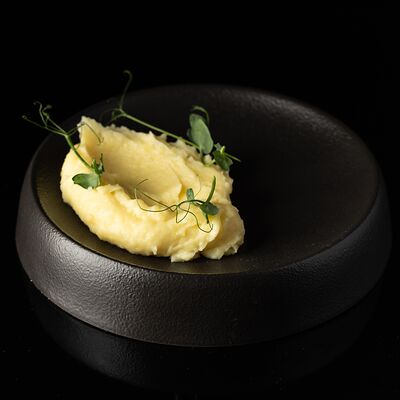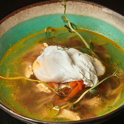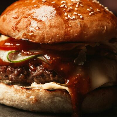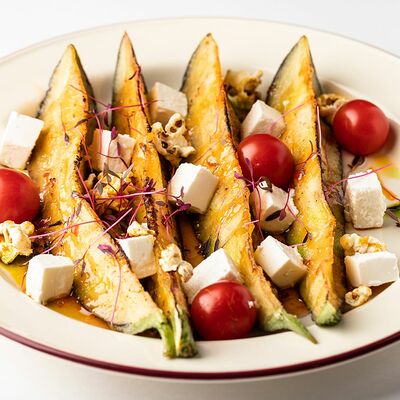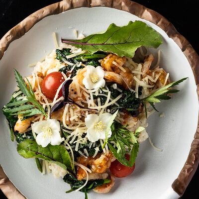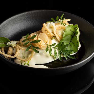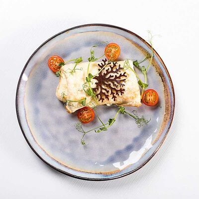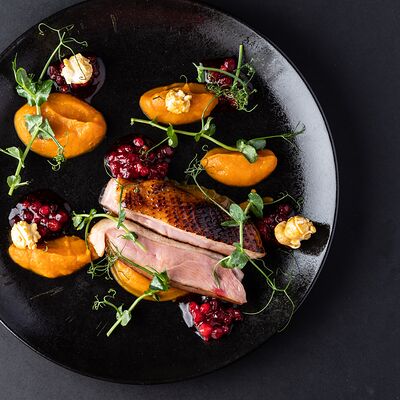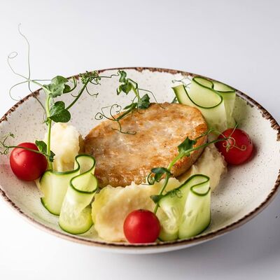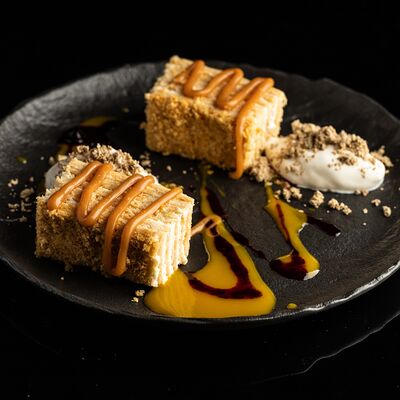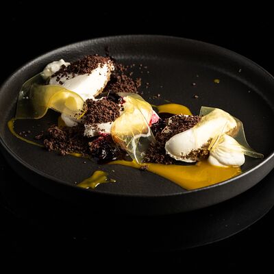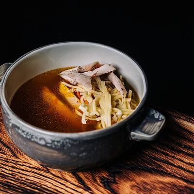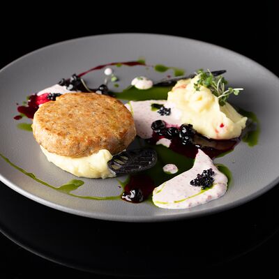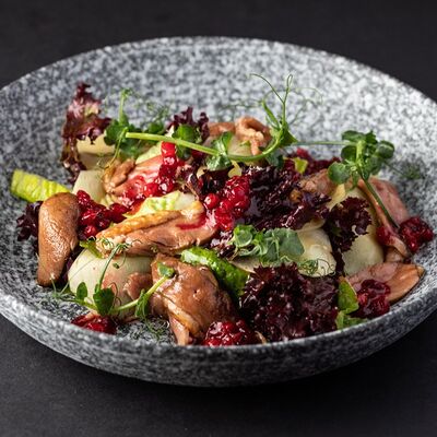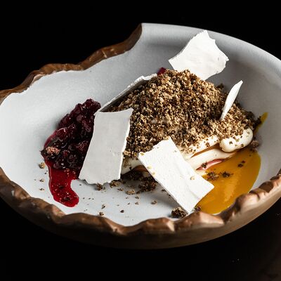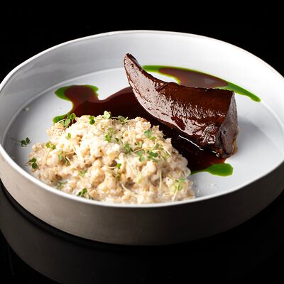 Томленый язык в соусе демиглас с ризотто из перловки и сыром копченый сулугуни