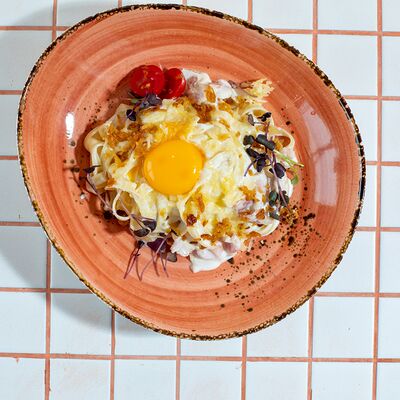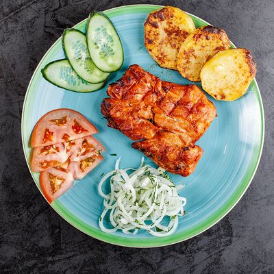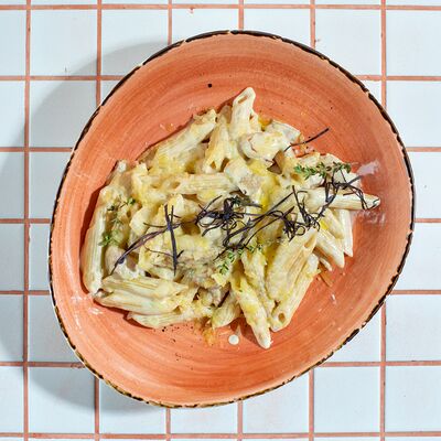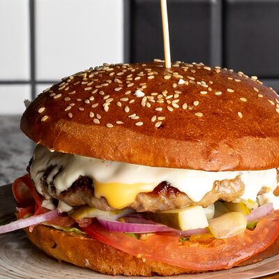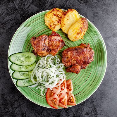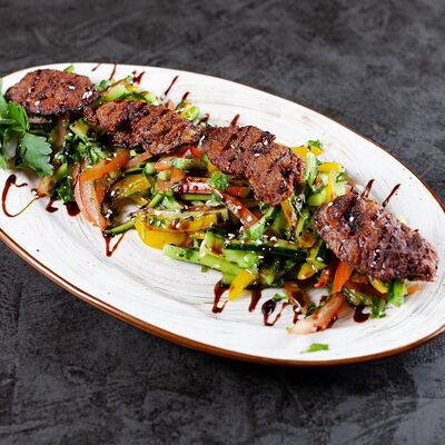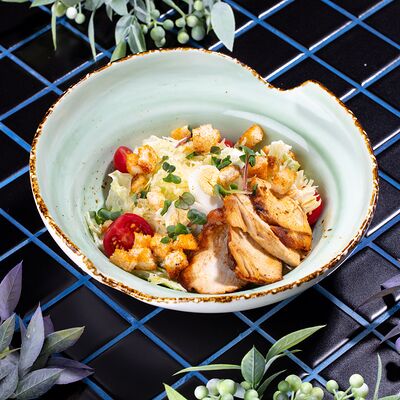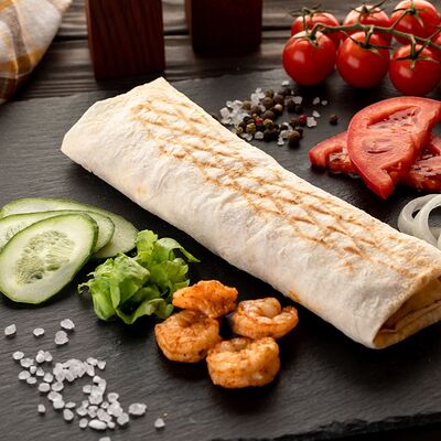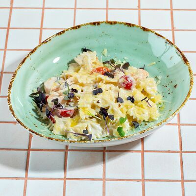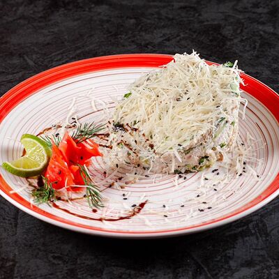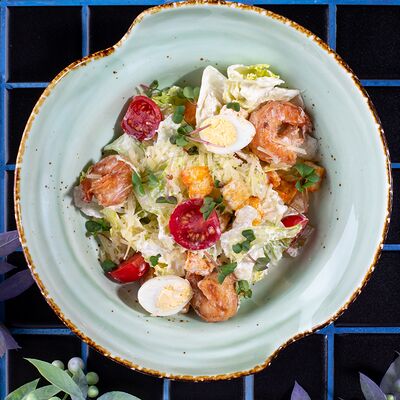 Огурец, куриная грудка, креветки, кальмары, сыр пармезан, соус