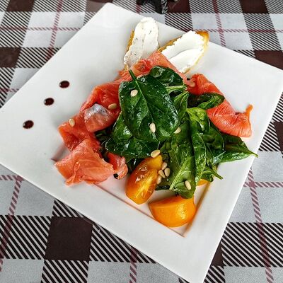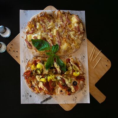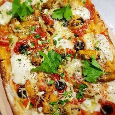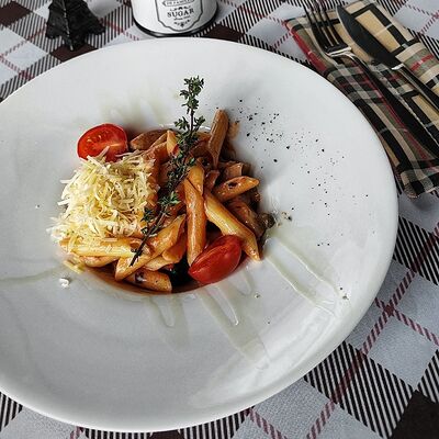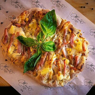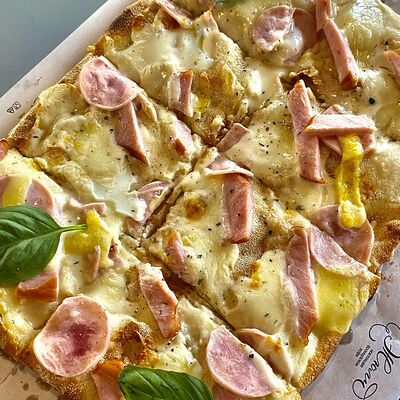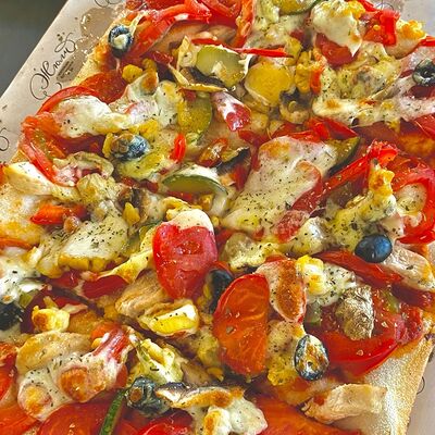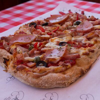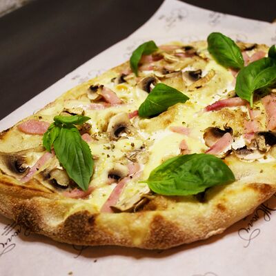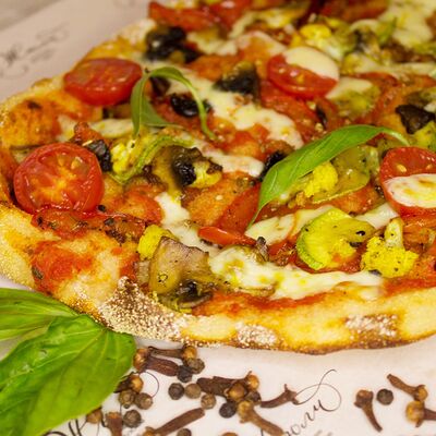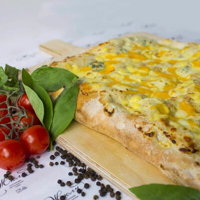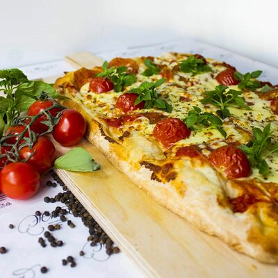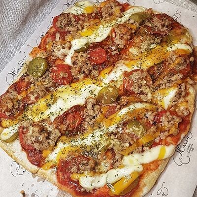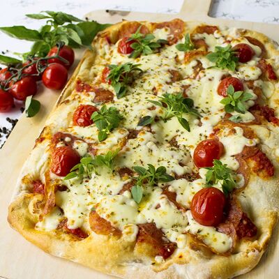 Тесто на пшеничной муке, томатный соус, моцарелла, колбаски пепперони, оливковое масло, помидоры