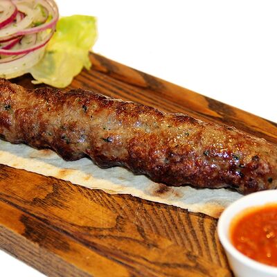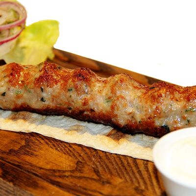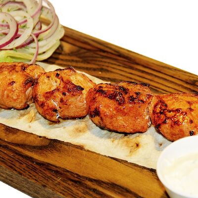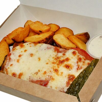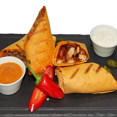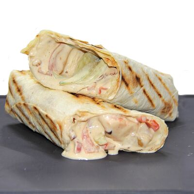 Куриное филе, маринованные огурцы, соус, салат айсберг, томаты, лепешка