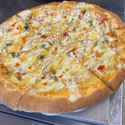 Соус манэ, сервелат, сыр, ветчина, куриное филе, лук красный, кунжут (30 см)