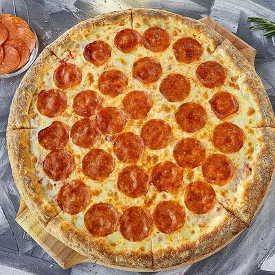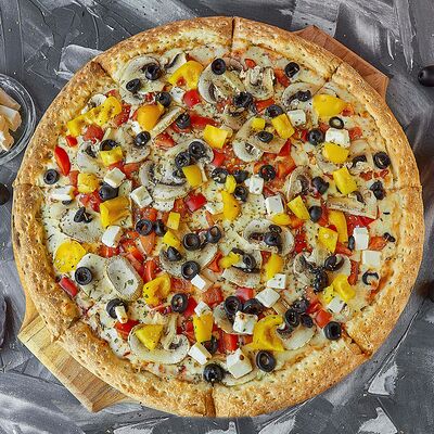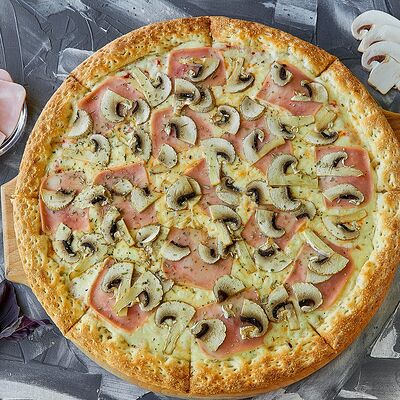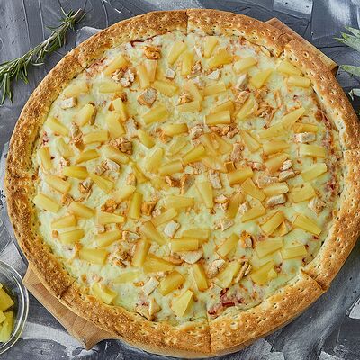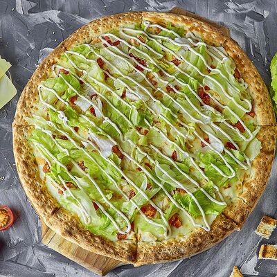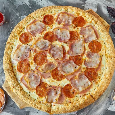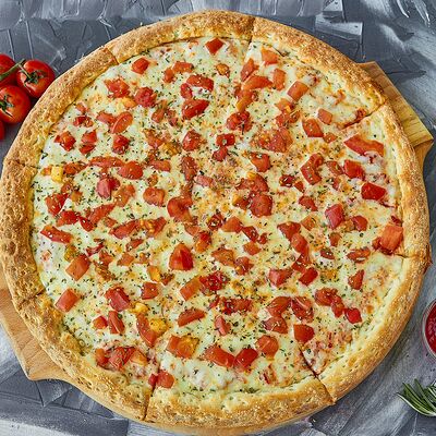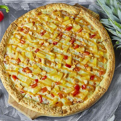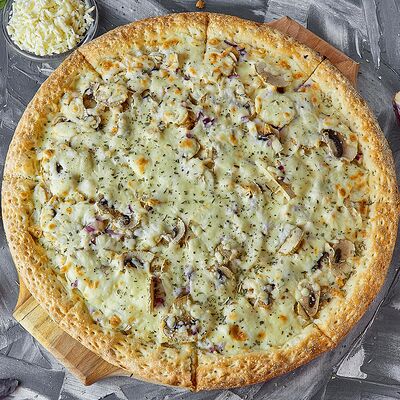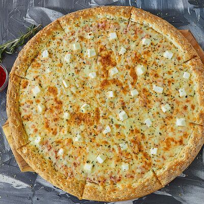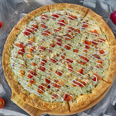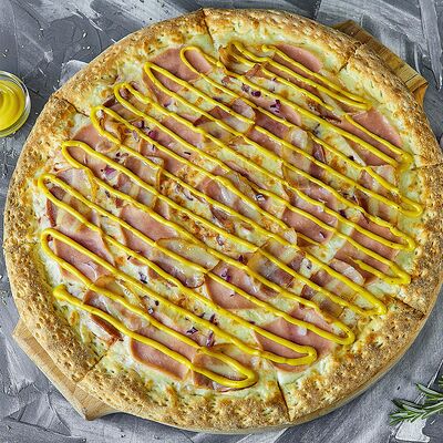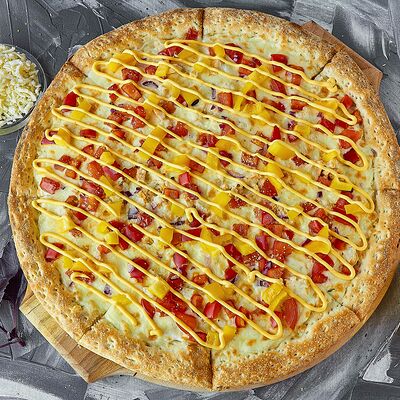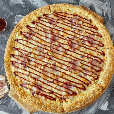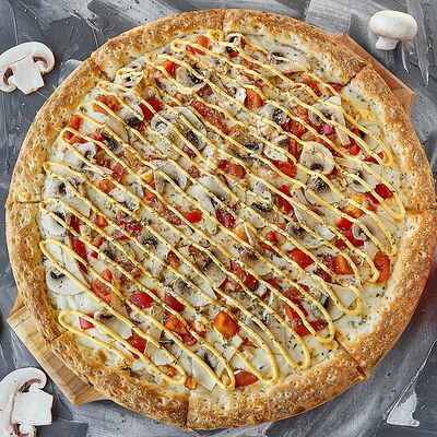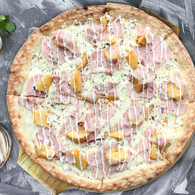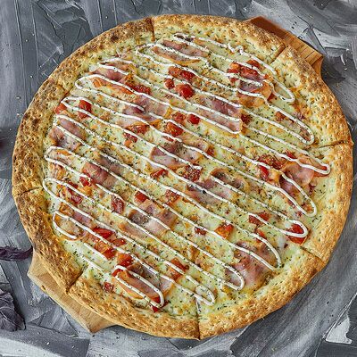 Соус ранч, сыр моцарелла, ветчина, картофель по-деревенски, красный лук, бекон, соус ранч, базилик, орегано