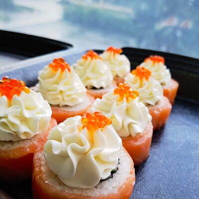 Лосось слабой соли, сливочный сыр, сыр моцарелла, томатный соус