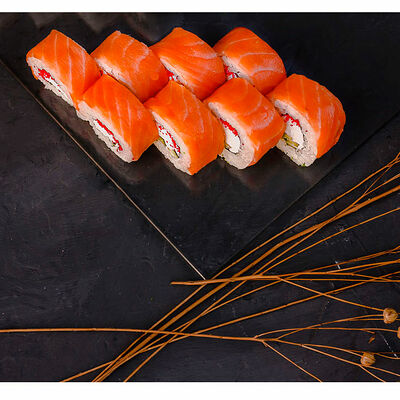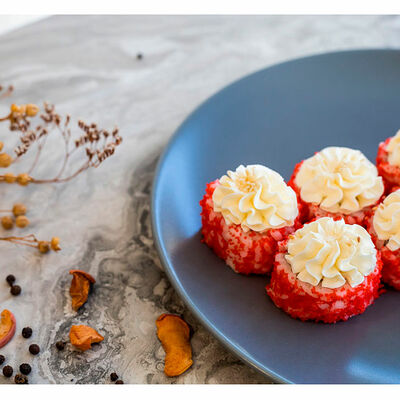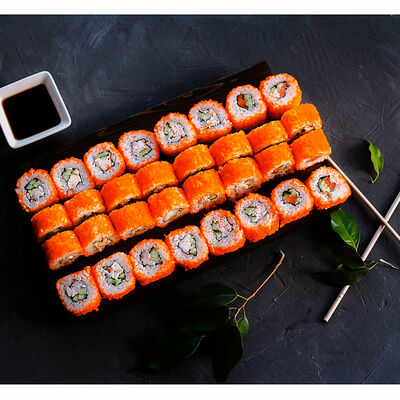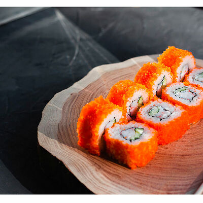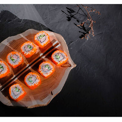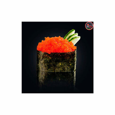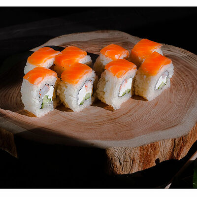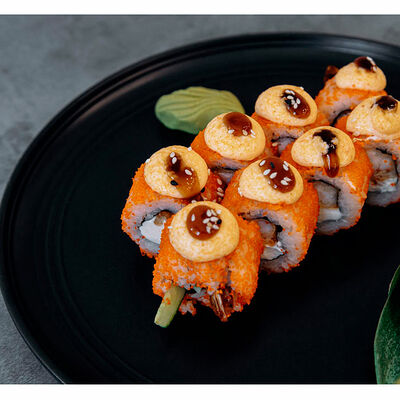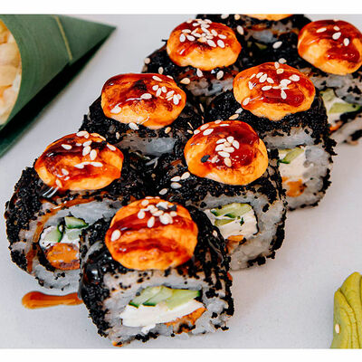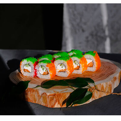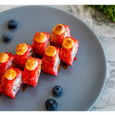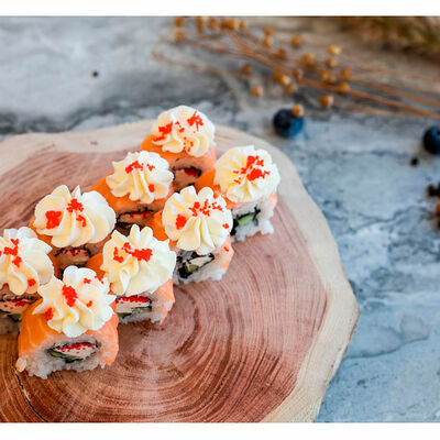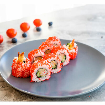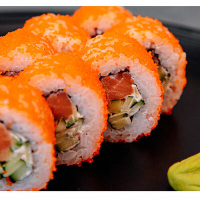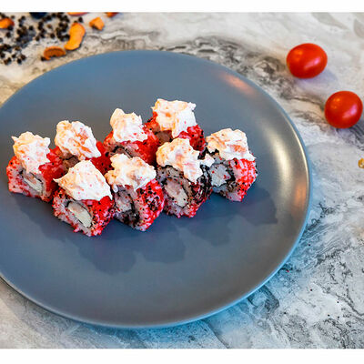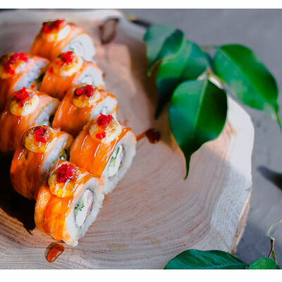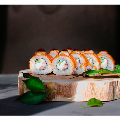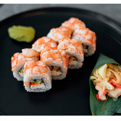 Сливочный сыр, креветка тигровая, спайси соус, икра масаго, огурец (8 шт.). Соевый соус (30 г), имбирь (30 г) и васаби (10 г) идут в комплекте