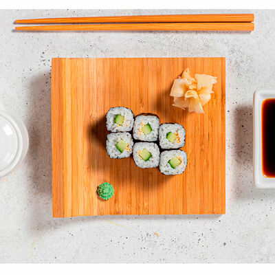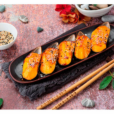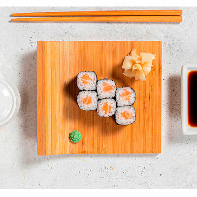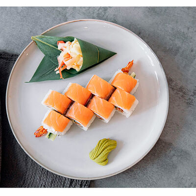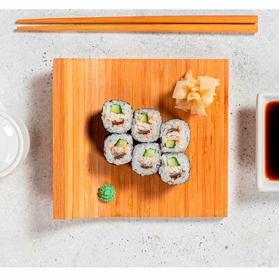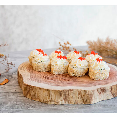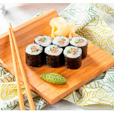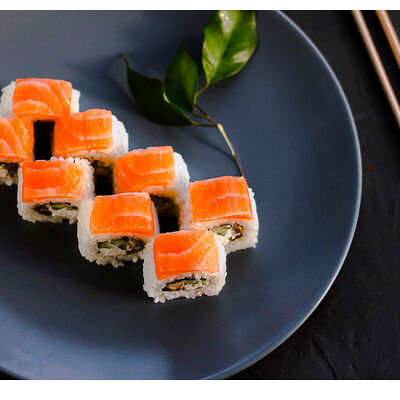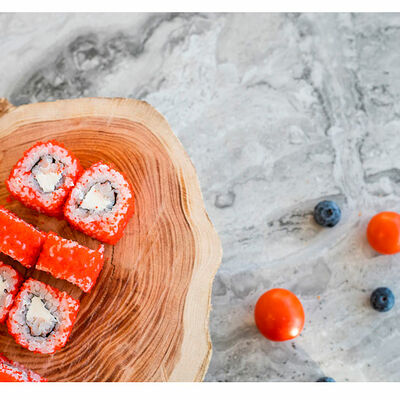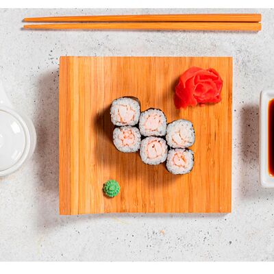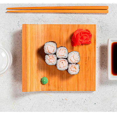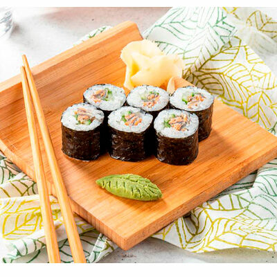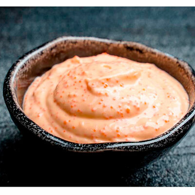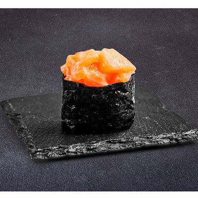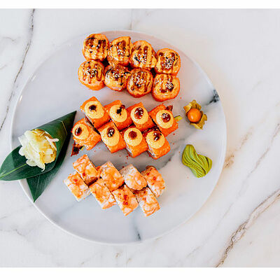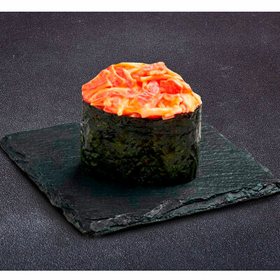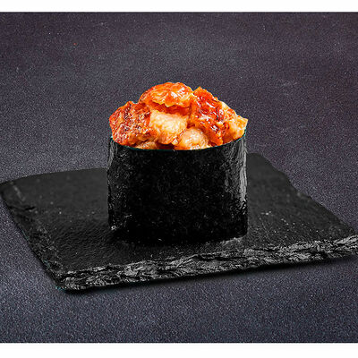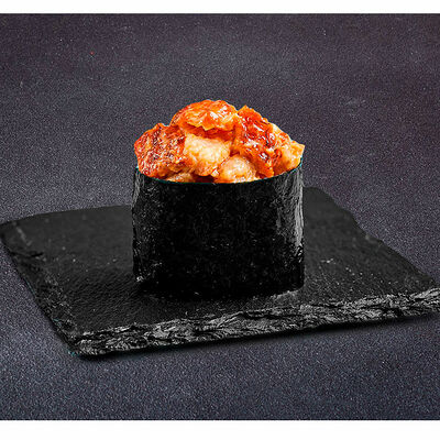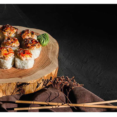 Сливочный сыр, креветка тигровая, спайси соус, икра масаго, огурец (8 шт.). Соевый соус (30 г), имбирь (30 г) и васаби (10 г) идут в комплекте