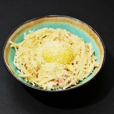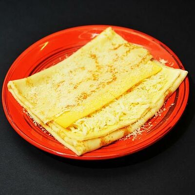 Тесто: яйцо, мука, молоко, сахар, соль, масло растительное. Яйцо глазунья, бекон, сыр чеддер, соус, зеленый лук
