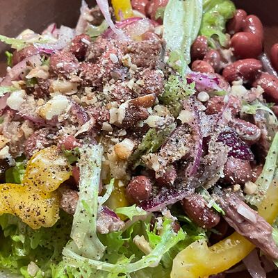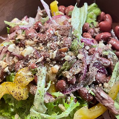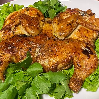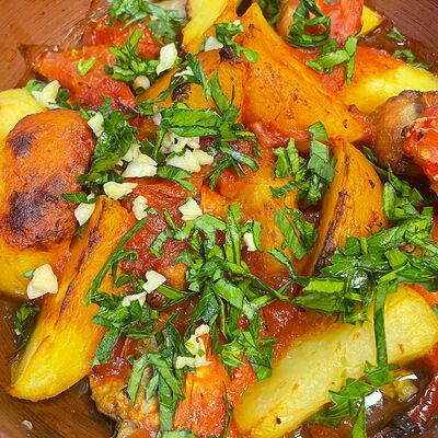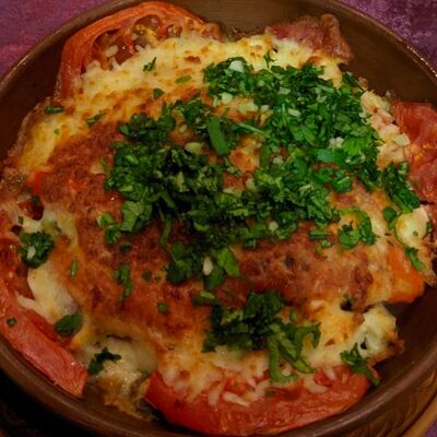 Курица, помидоры, домашний сыр, зелень, специи и пряности