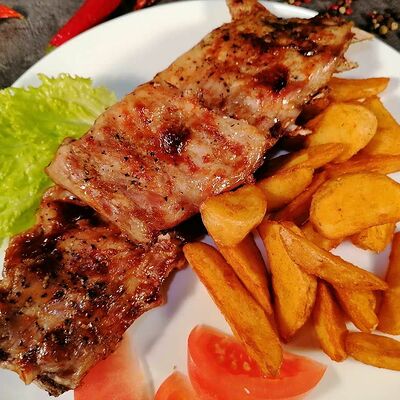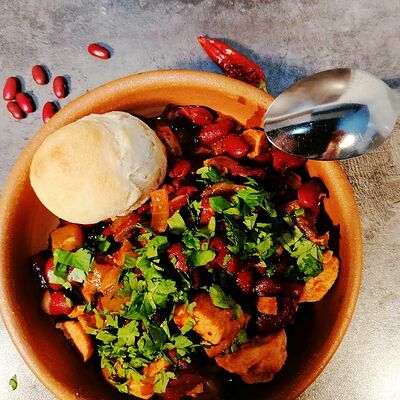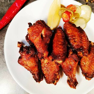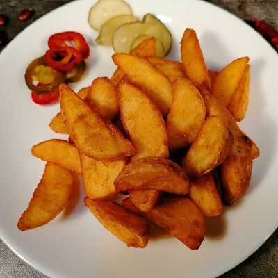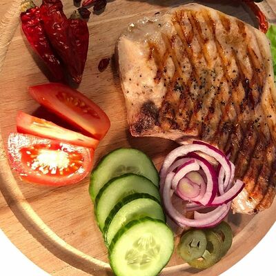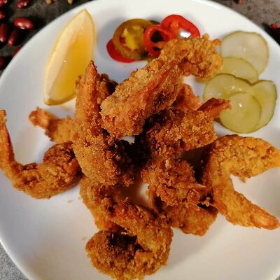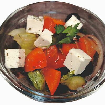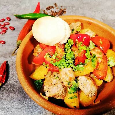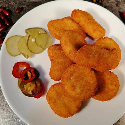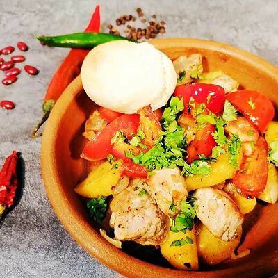 Баклажаны хрустящие в соусе чили-джем, томаты, сыр сливочный, салат, специи