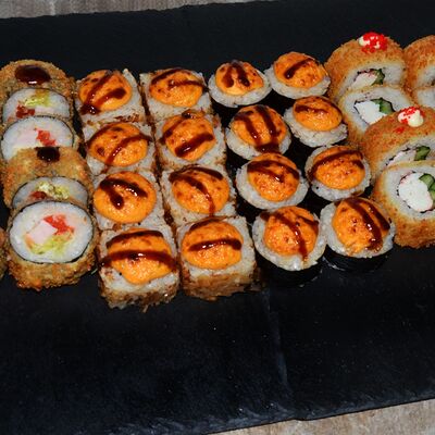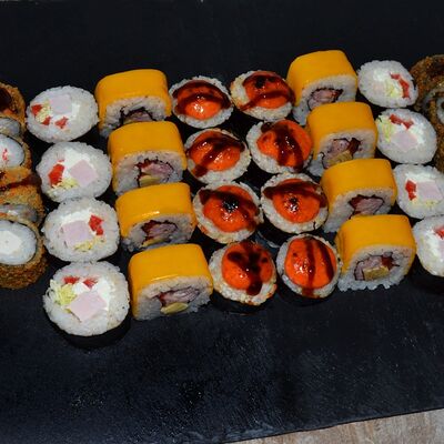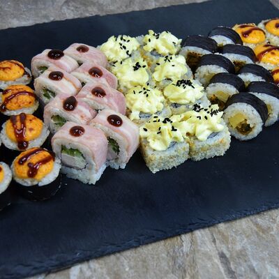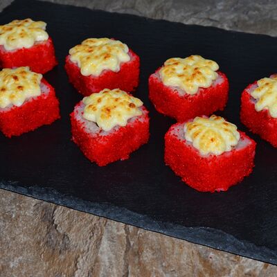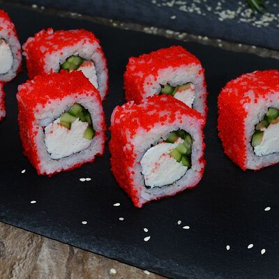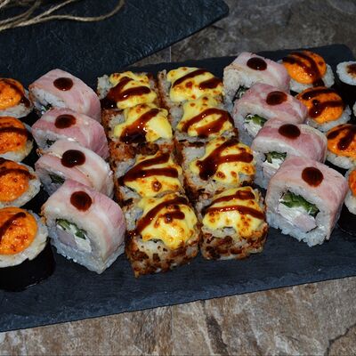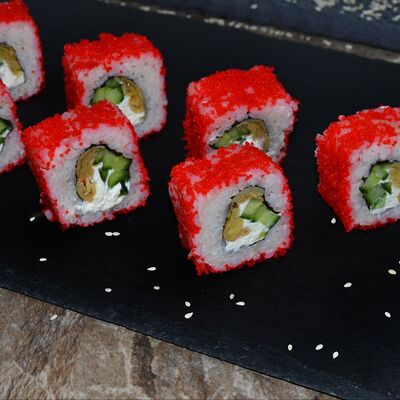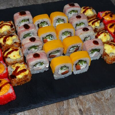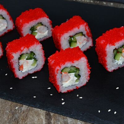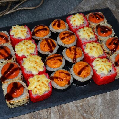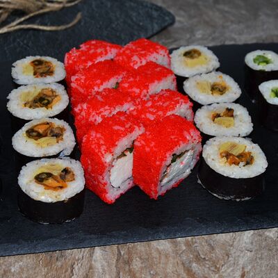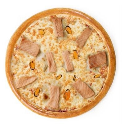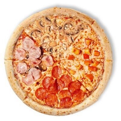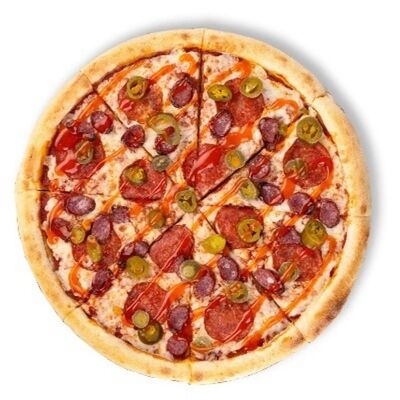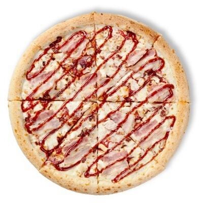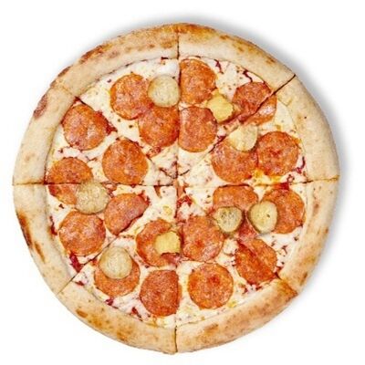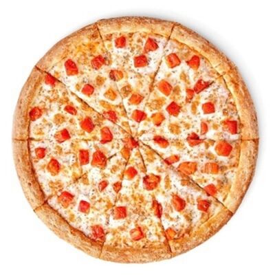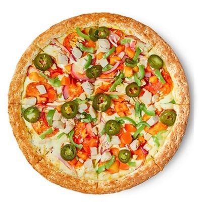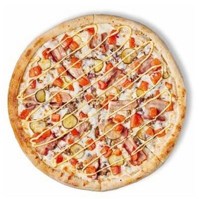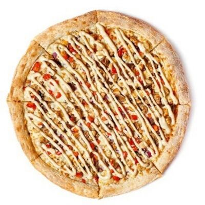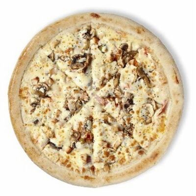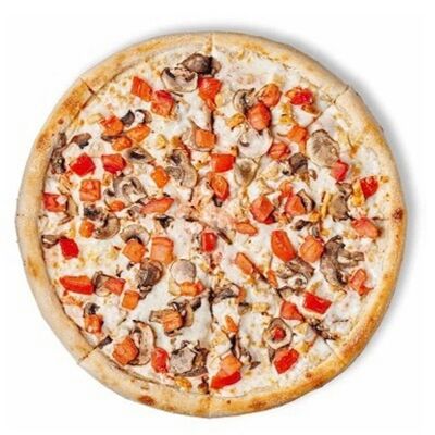 Томатный соус, курица, шампиньоны, перец сладкий, огурцы маринованные, лук красный, моцарелла, орегано, соус цезарь
