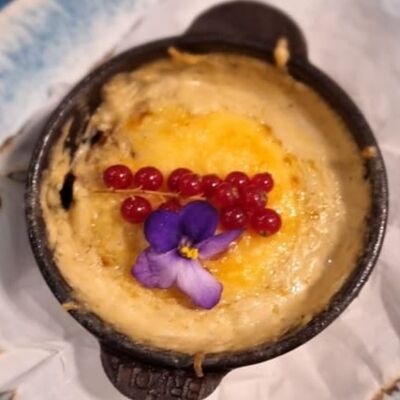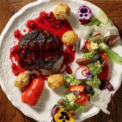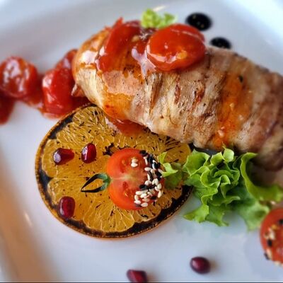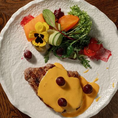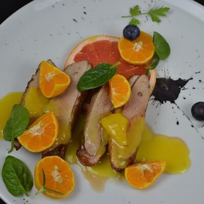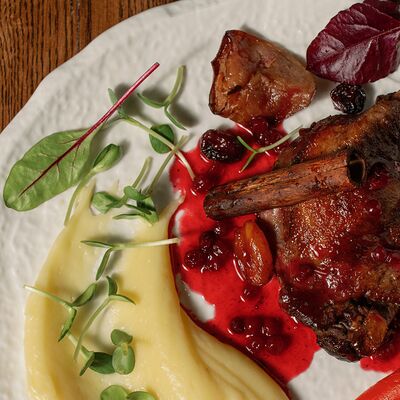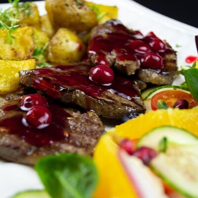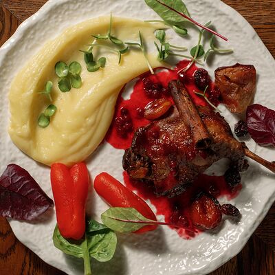Утиная ножка, соус брусничный, курага, чернослив, вишня замороженная, яблоко, корица, сок вишнёвый
