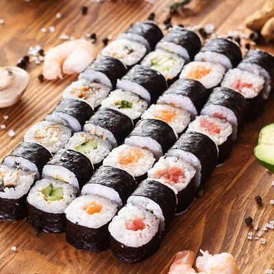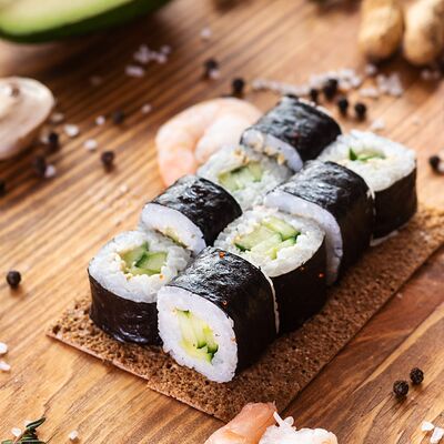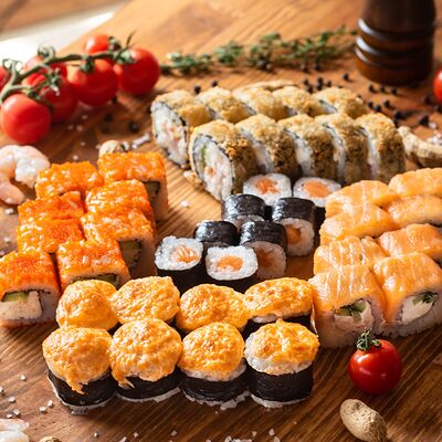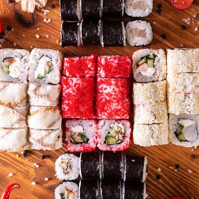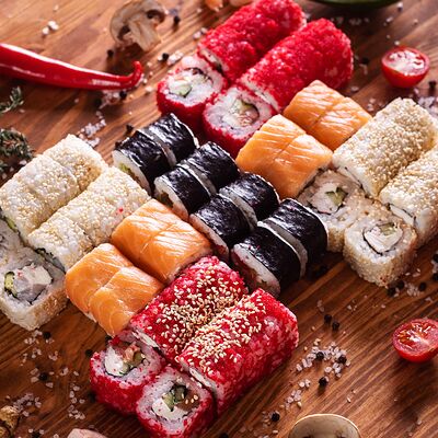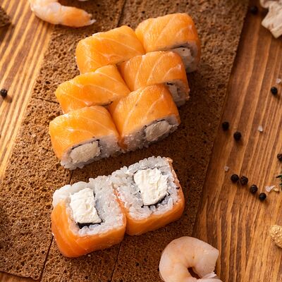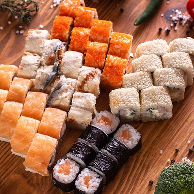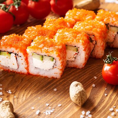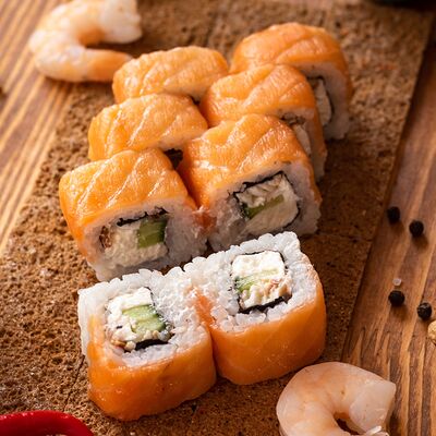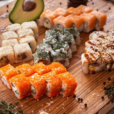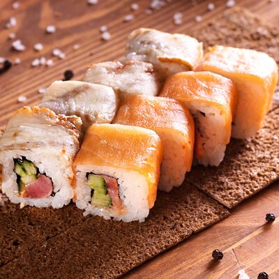 Три короля, Сакура, Мануил яки, ролл с креветкой, ролл с огурцом