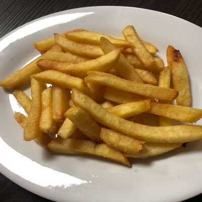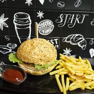 Пшеничная булочка, говяжья котлета, сыр чеддер, помидор, лист салата, красный лук, соленый огурец, соус для бургера. Картофель фри и кетчуп