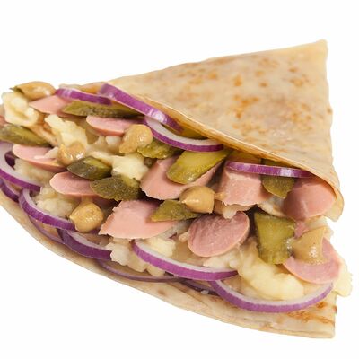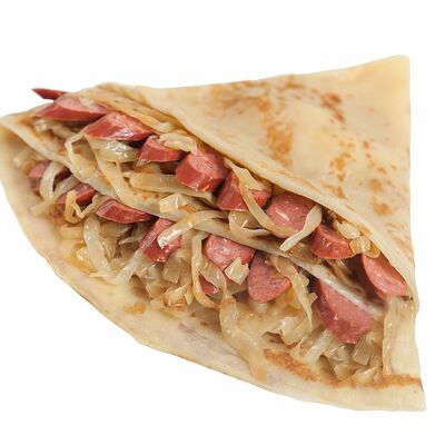 Тесто блинное, капуста белокочанная тушеная, колбаски охотничьи