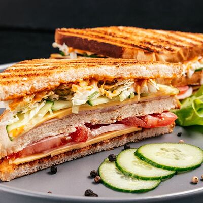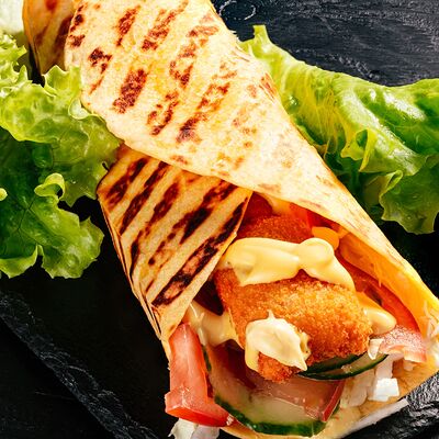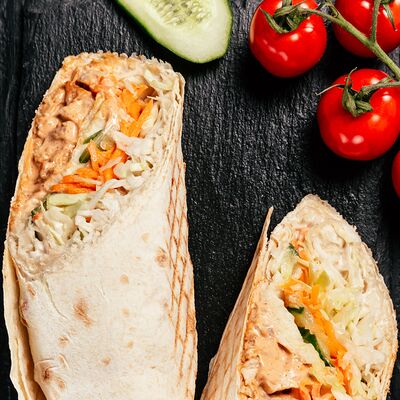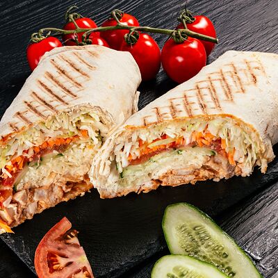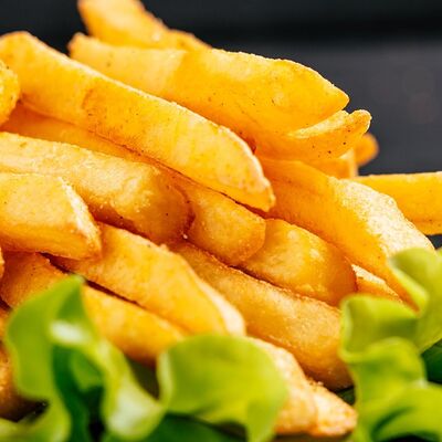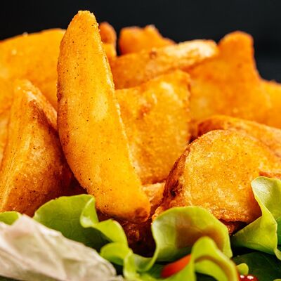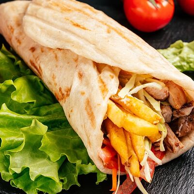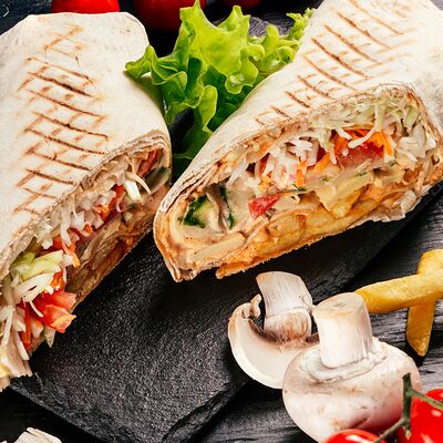 Картофель фри, шампиньоны маринованные, помидоры, огурцы, капуста, корейская морковь, два фирменных соуса