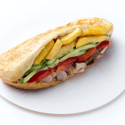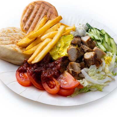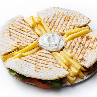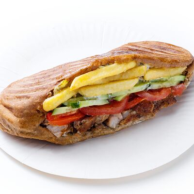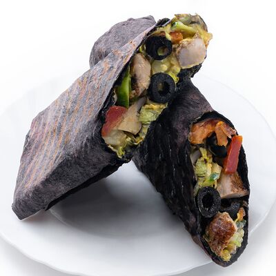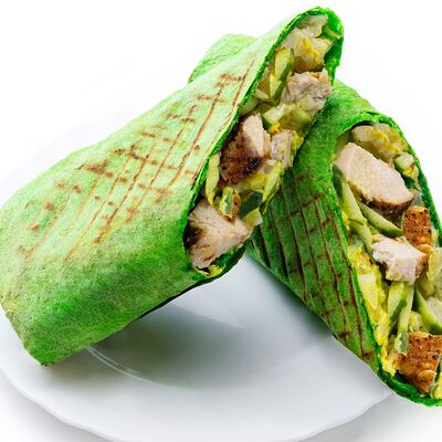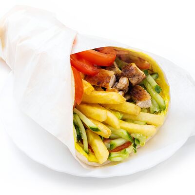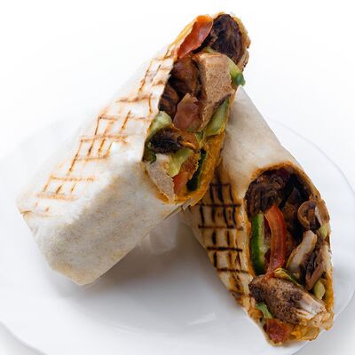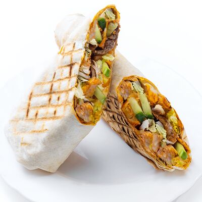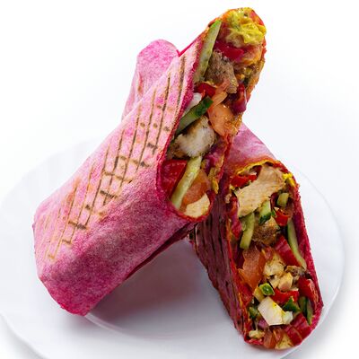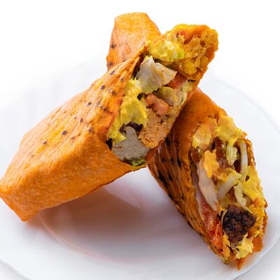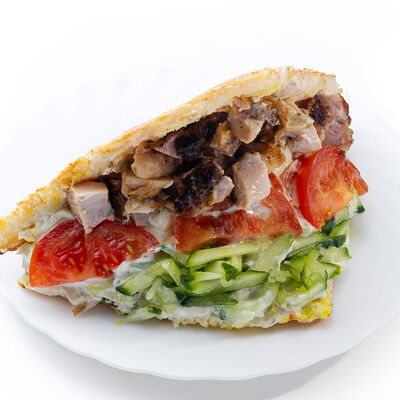 Лаваш для шаурмы, курица, капуста микс, свежие помидоры и огурцы, перец горький, соусы белый, желтый, красный