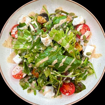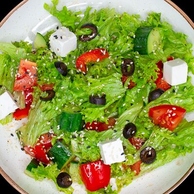 Огурец, помидор, болгарский перец, лист салата, сыр фета, маслины