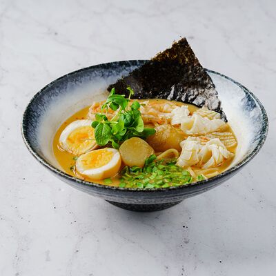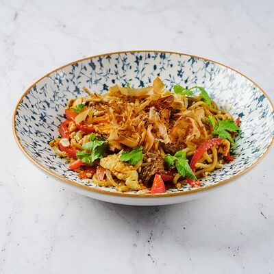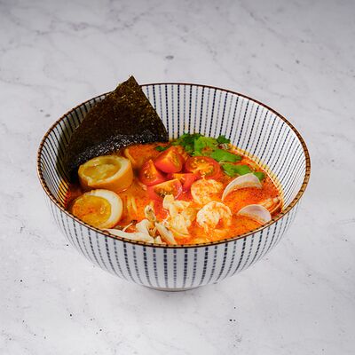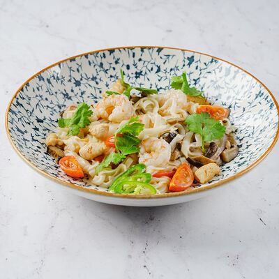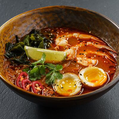 Ароматный говяжий бульон с рисовой лапшой и говядиной, соевыми ростками, кинзой, мятой, базиликом, перцем чили, красным и зеленым луком