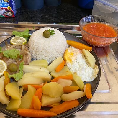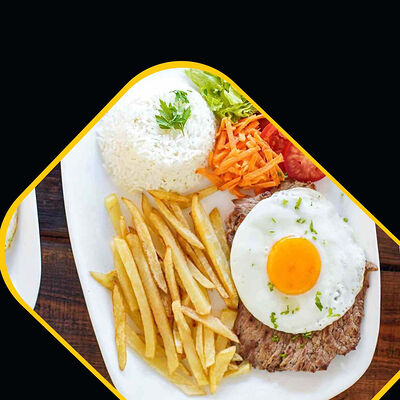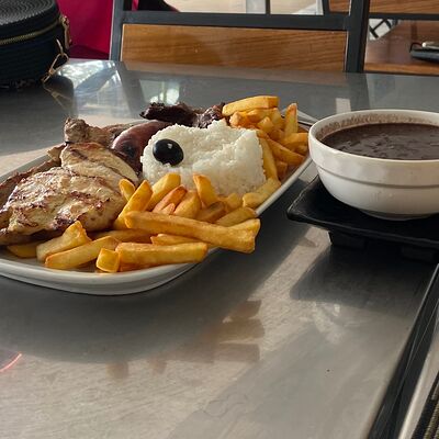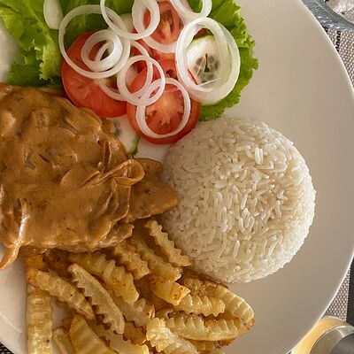 Курица, картошка фри, салат