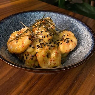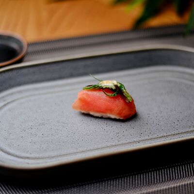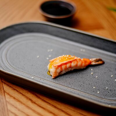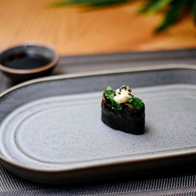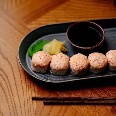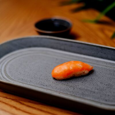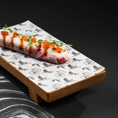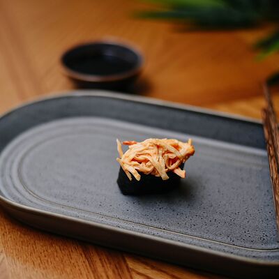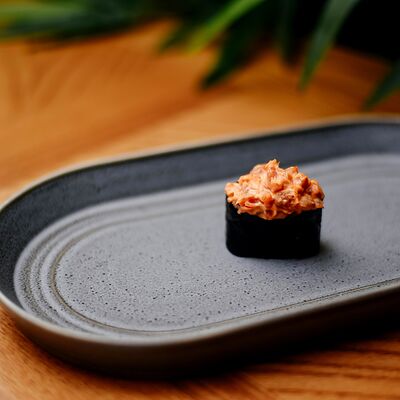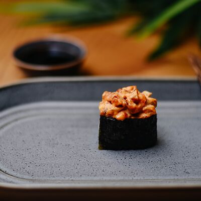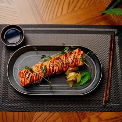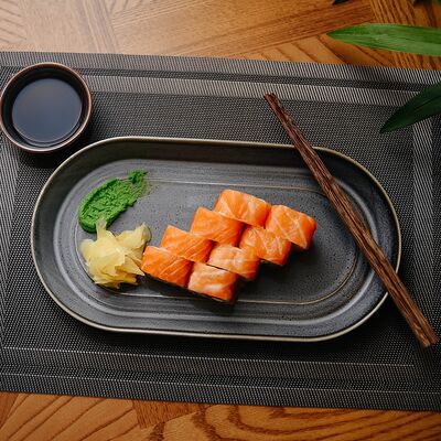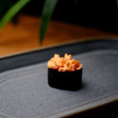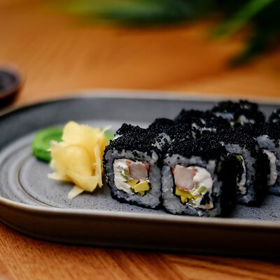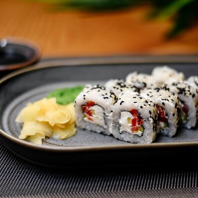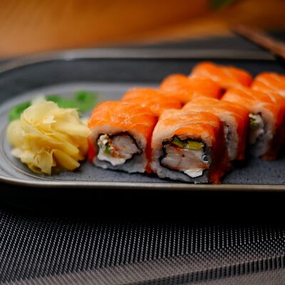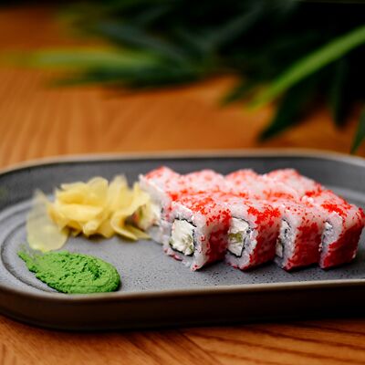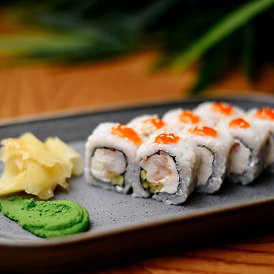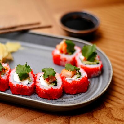 Рис, филе лосося, нори, сливочный сыр, икра масаго красная, огурец, лук зеленый, темпурная панировка, сухари, соус сладкий чили, икра масаго (черная и красная), микрозелень