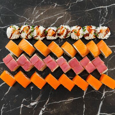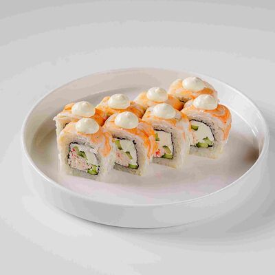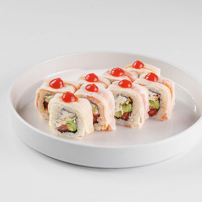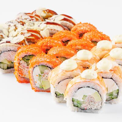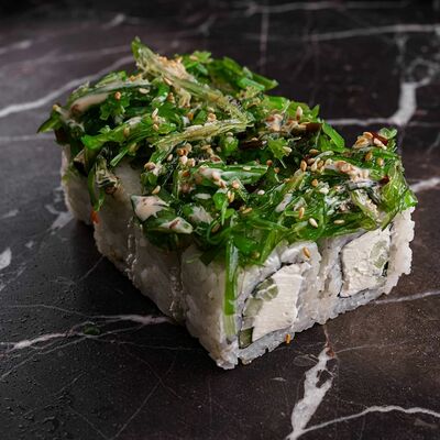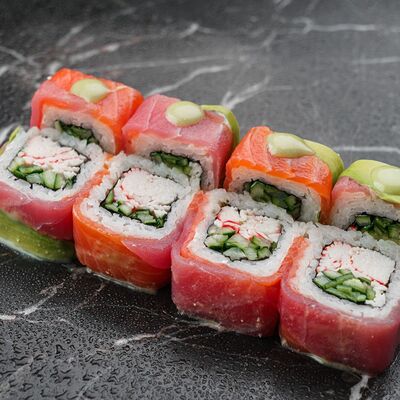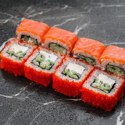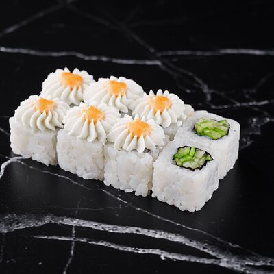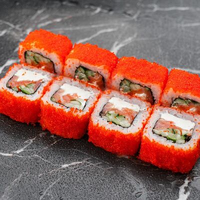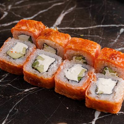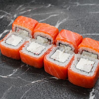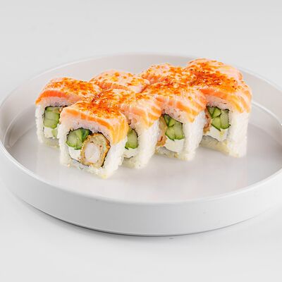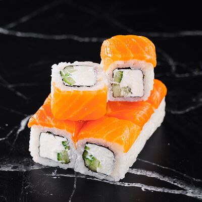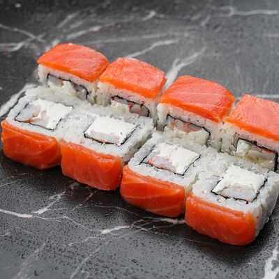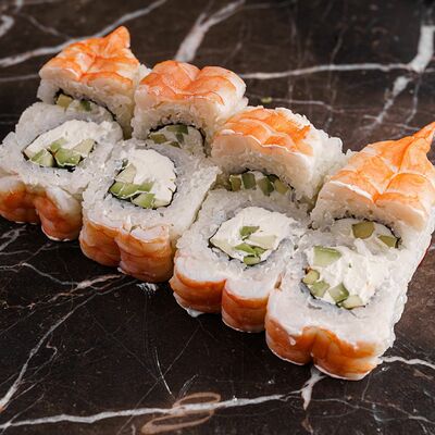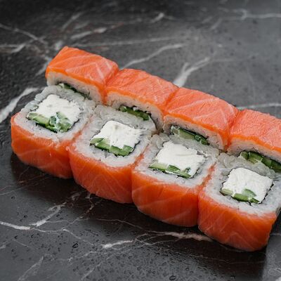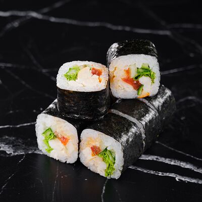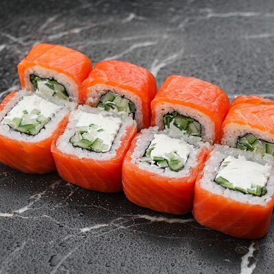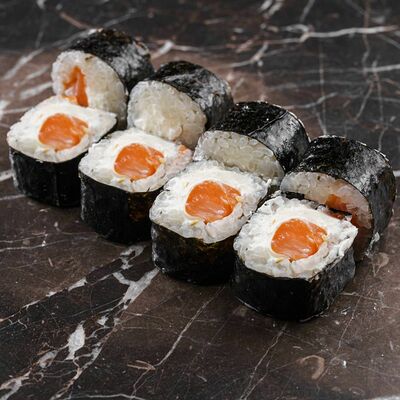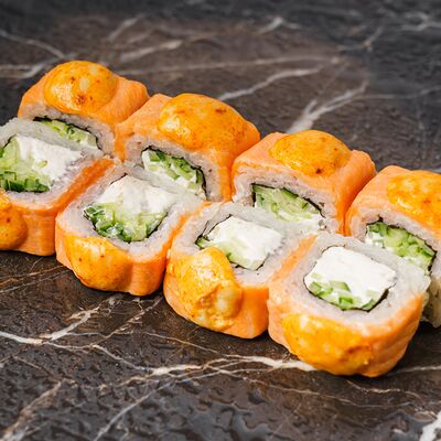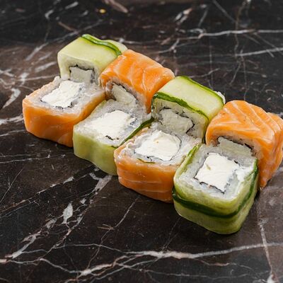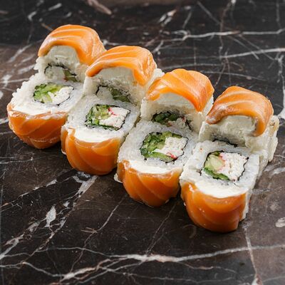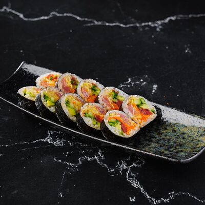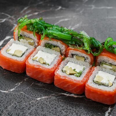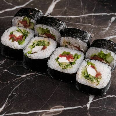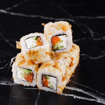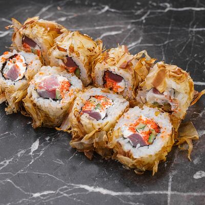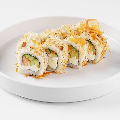 Рис, нори, сливочный сыр, лосось, огурец, стружка тунца