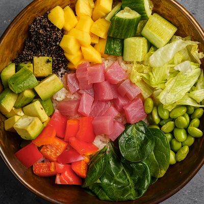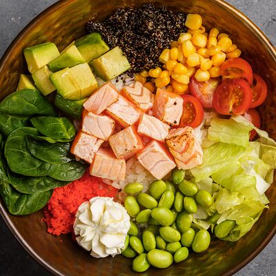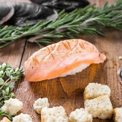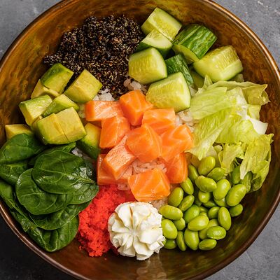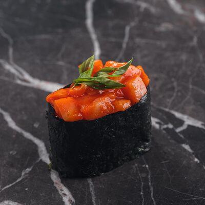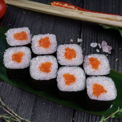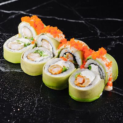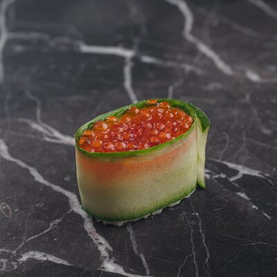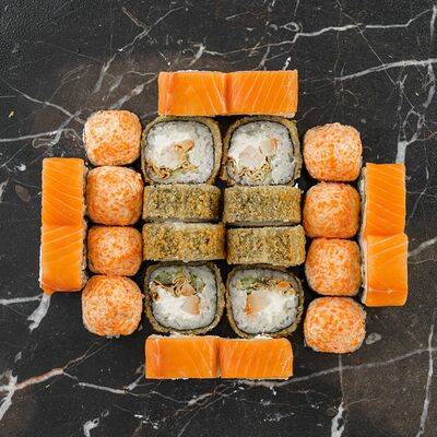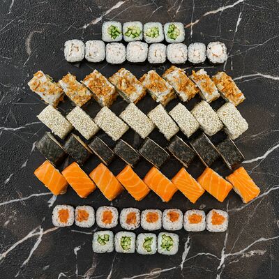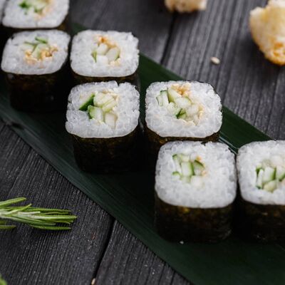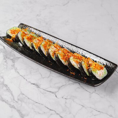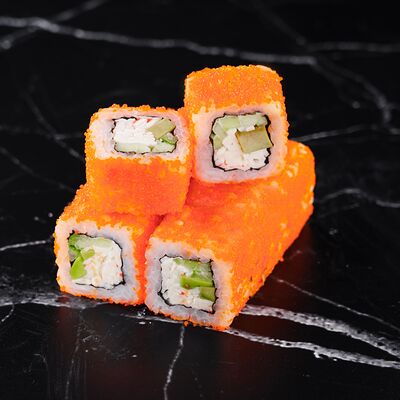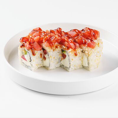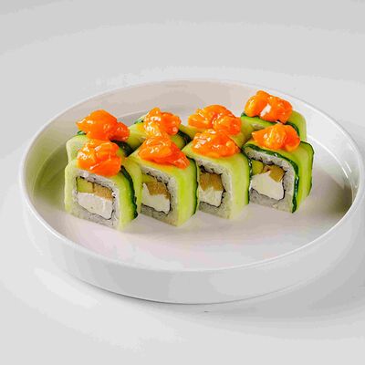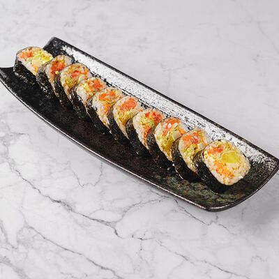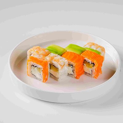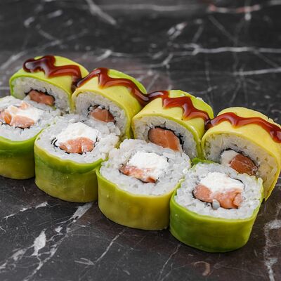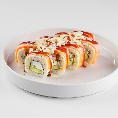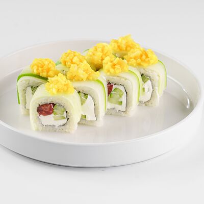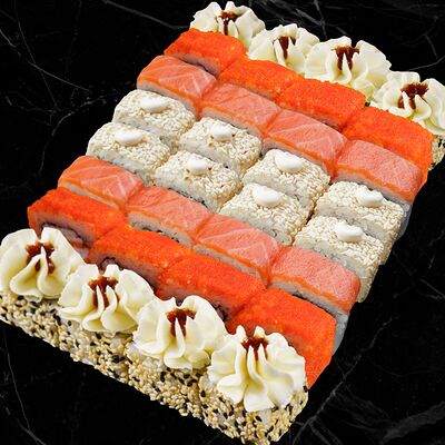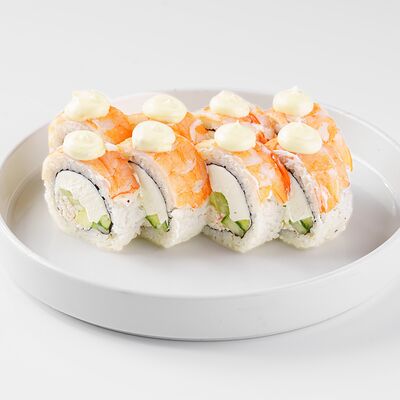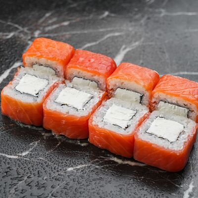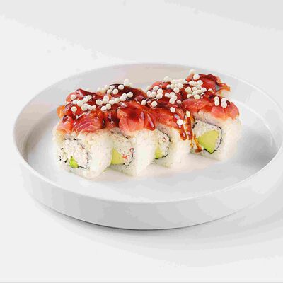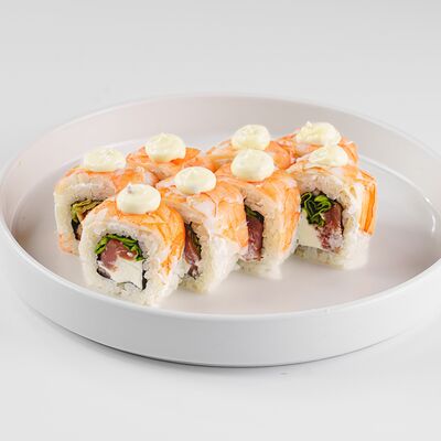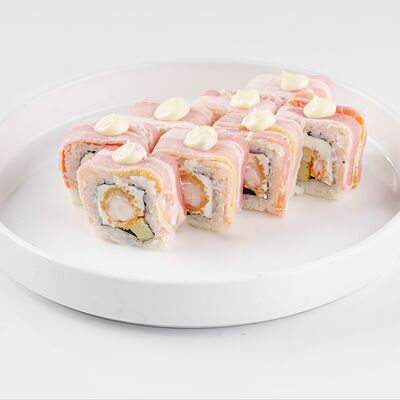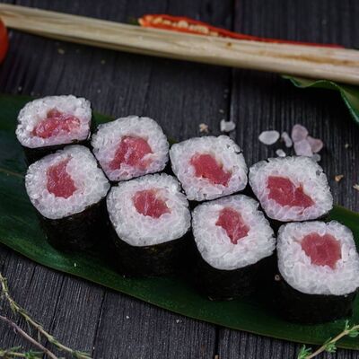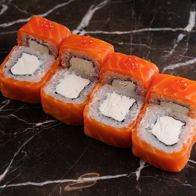 Рис, нори, сливочный сыр, лосось, огурец, стружка тунца
