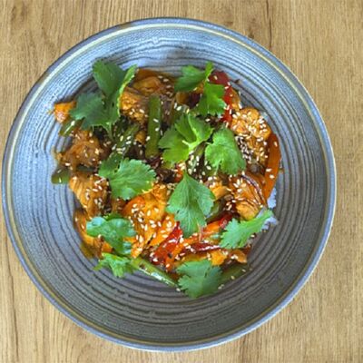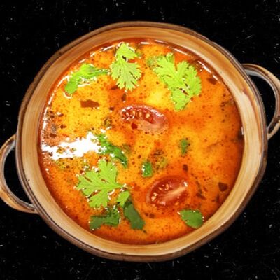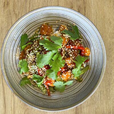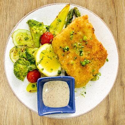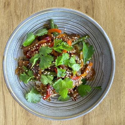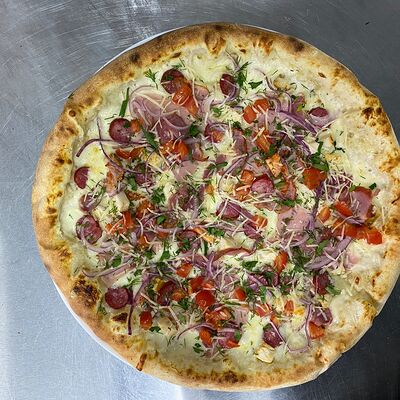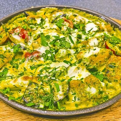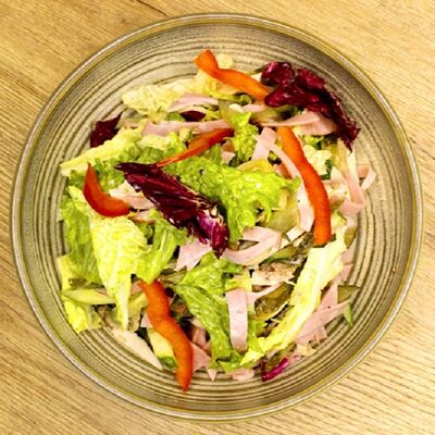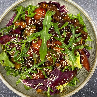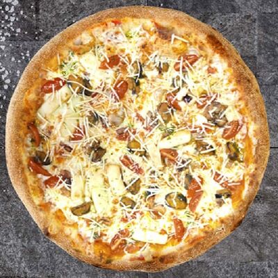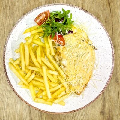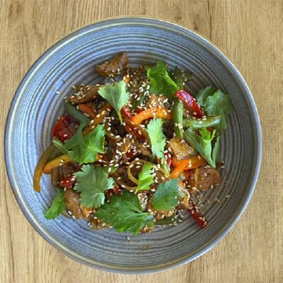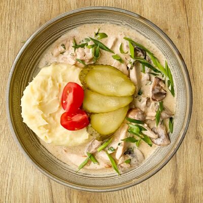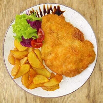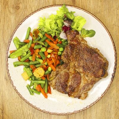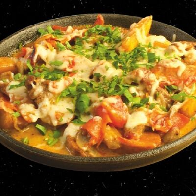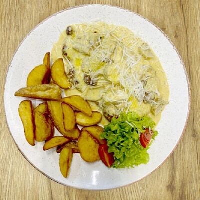 Свинина, картофель по-деревенски, помидор, шампиньоны, лук, морковь