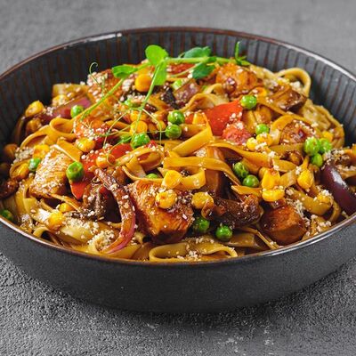 Лапша, куриное филе, лук, грибы, морковь, свежий горох, кукуруза, кисло-сладкий соус