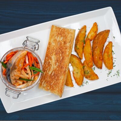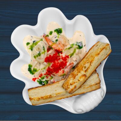 Мидии с соусом том ям, картофель фри, багет