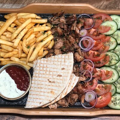 Мясо (курица), помидоры, огурцы, лук, зелень, соус грузинский