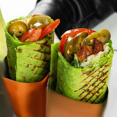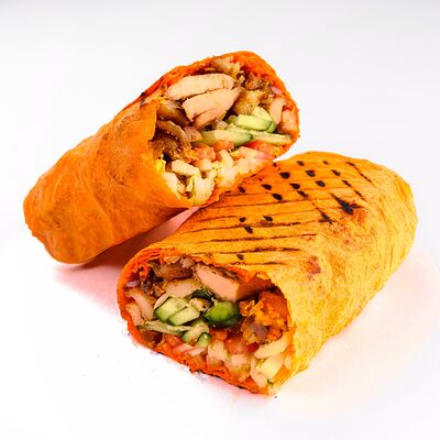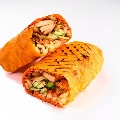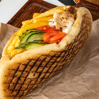 Лаваш, пекинская капуста, фирменный чесночный соус, помидоры, огурцы, филе куриной грудки, моцарелла, сырный соус