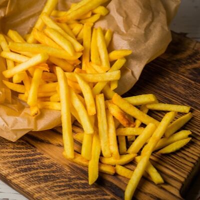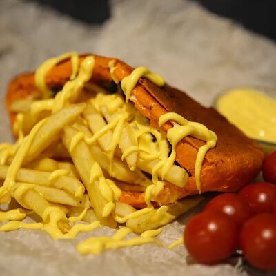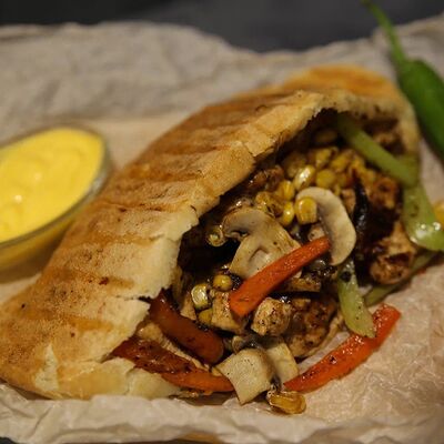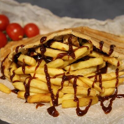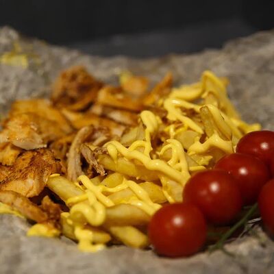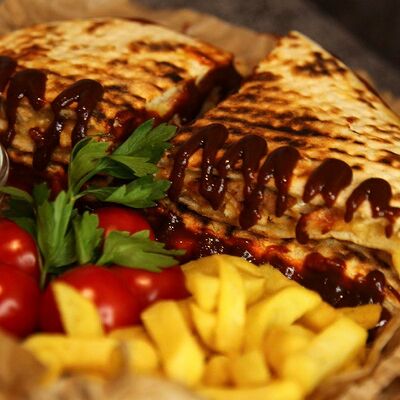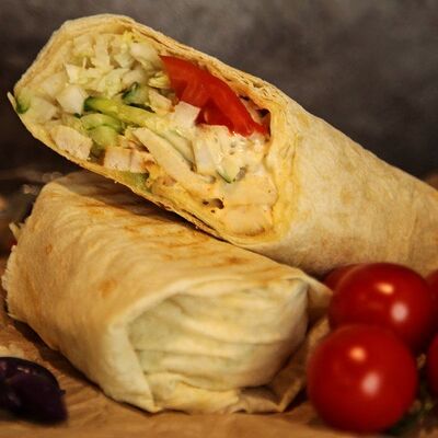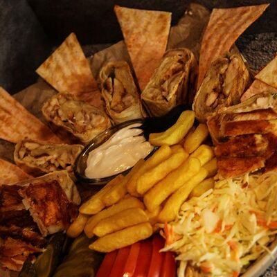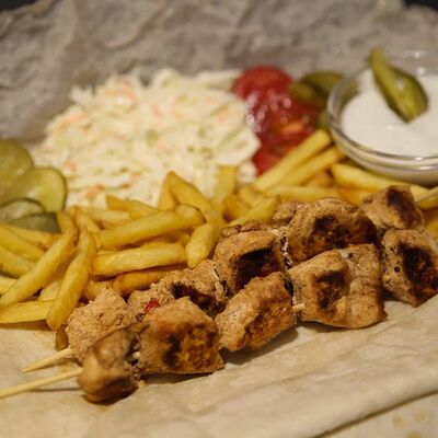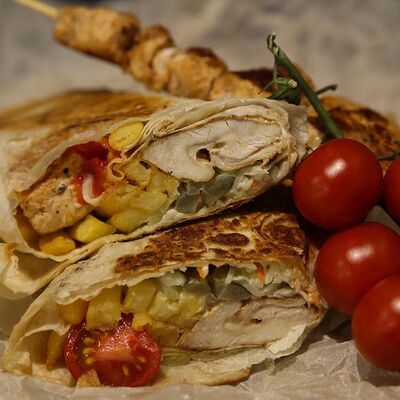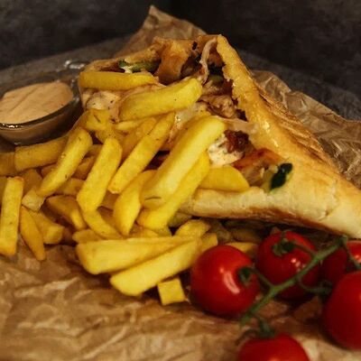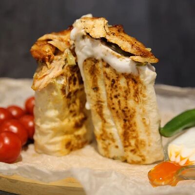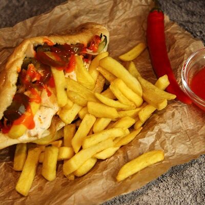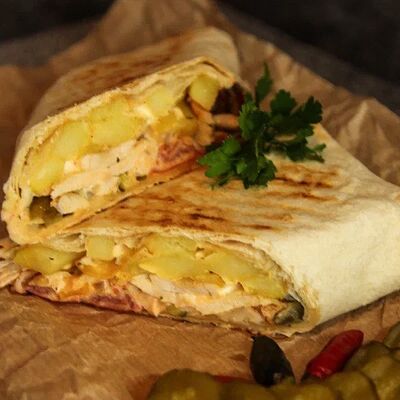 Куриное филе приготовленное на гриле, лаваш, картофель фри, салат арабский, соленые огурцы, помидоры, чесночный соус