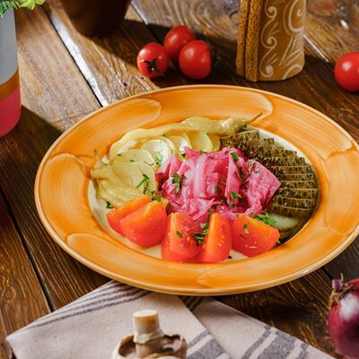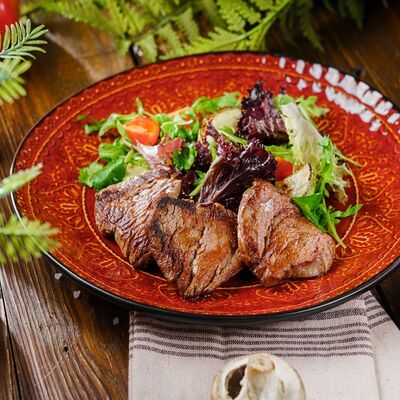 Телятина сырокопченая, бараний язык, сало пряного посола, перец цицак, зелень