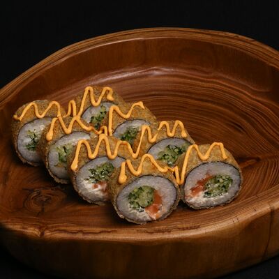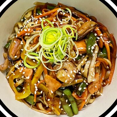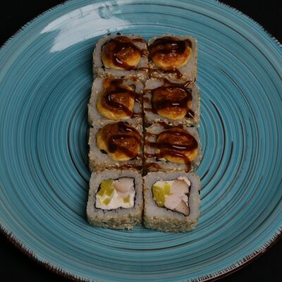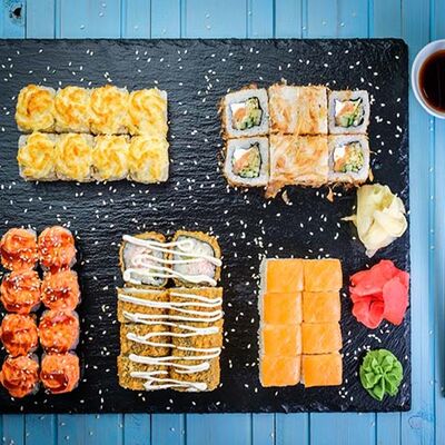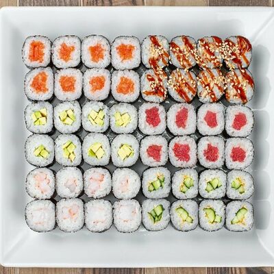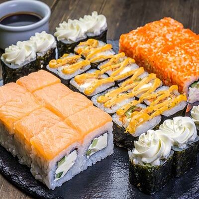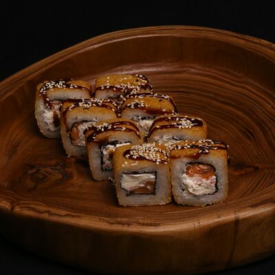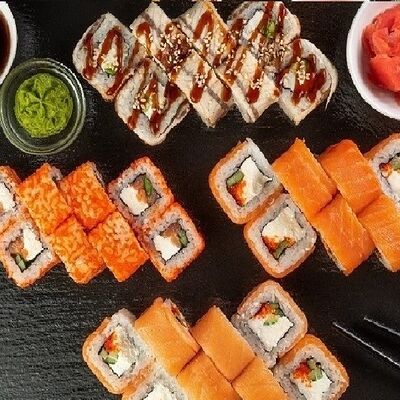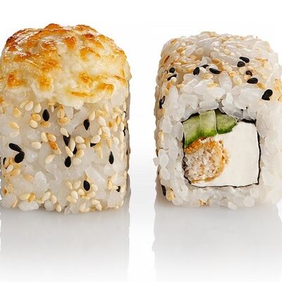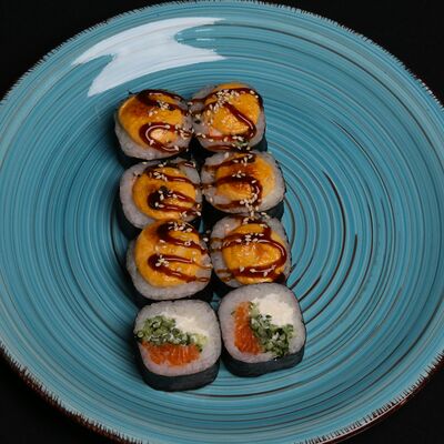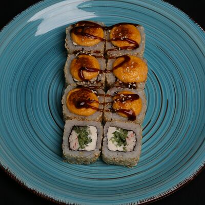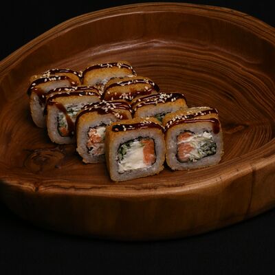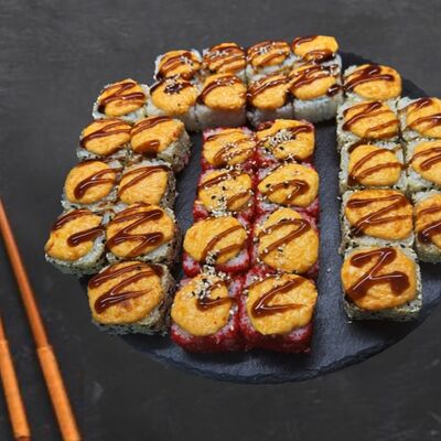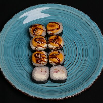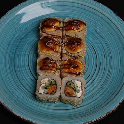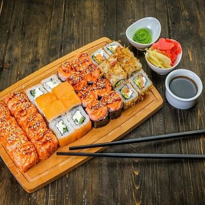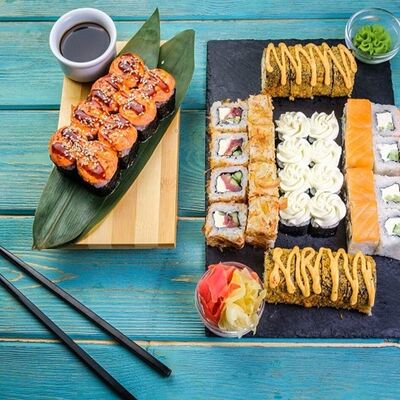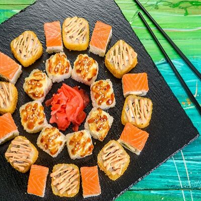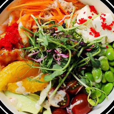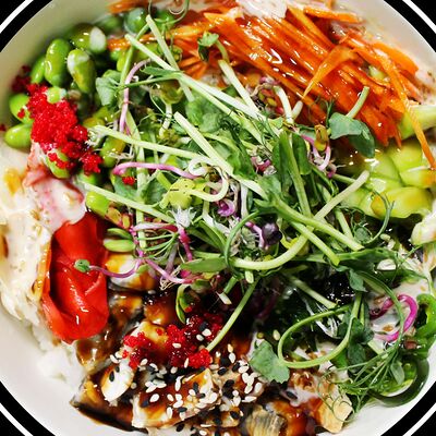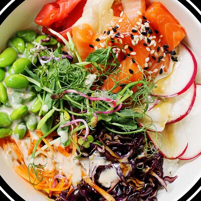 Рис заправленный, лосось, соус ореховый, капуста красная, бобы эдамаме, редис, имбирь, морковь, салат чука, соевый соус, соус терияки, икра, микрозелень, кунжут