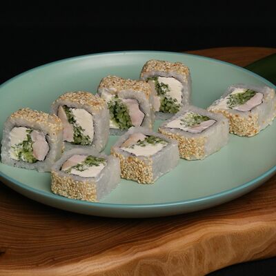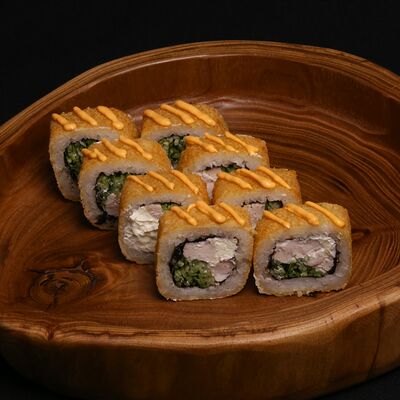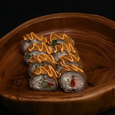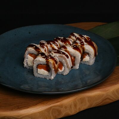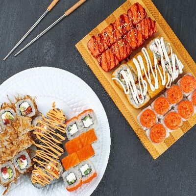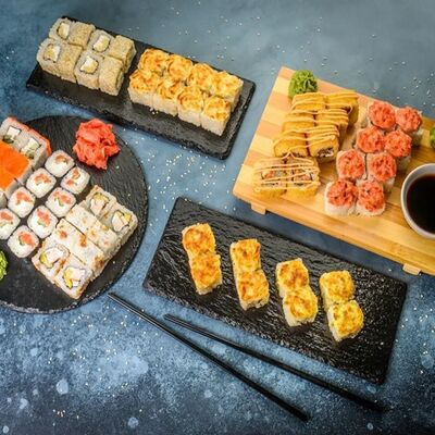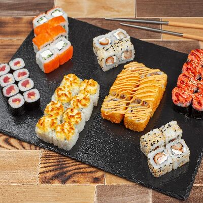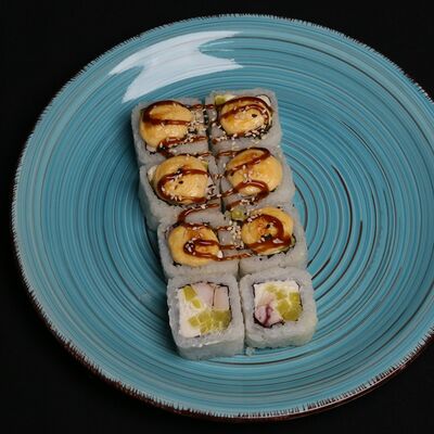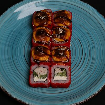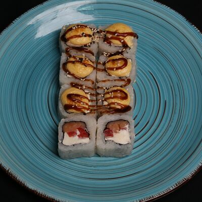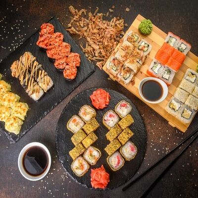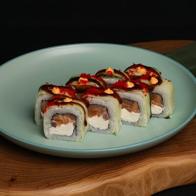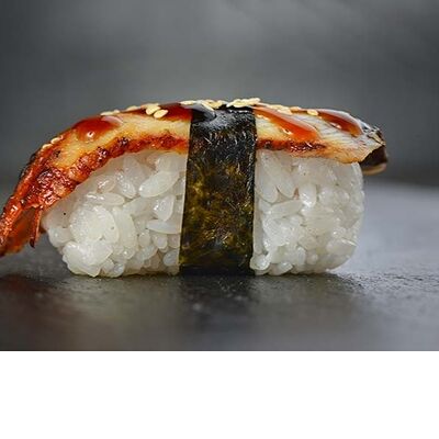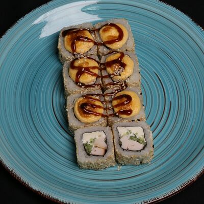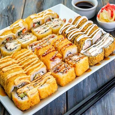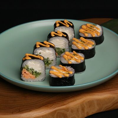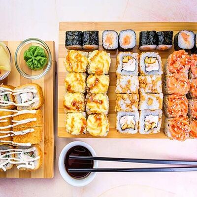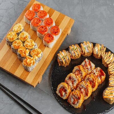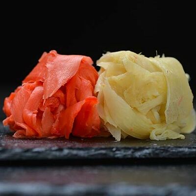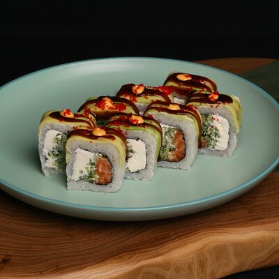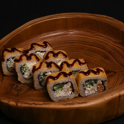 Рис заправленный, лосось, соус ореховый, капуста красная, бобы эдамаме, редис, имбирь, морковь, салат чука, соевый соус, соус терияки, икра, микрозелень, кунжут
