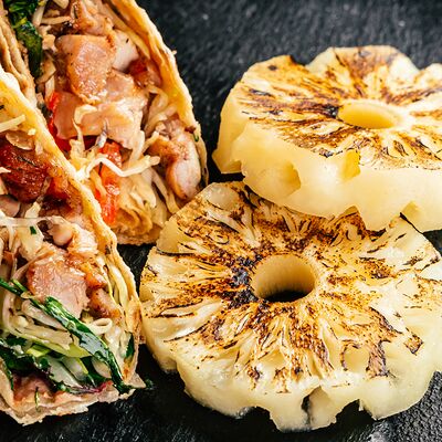 Баранина, соус красный, соус белый, мостарда, помидор, огурец, лук, зелень, капустный микс (белая, красная, пекинская), острый перец, халапеньо