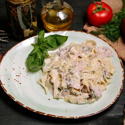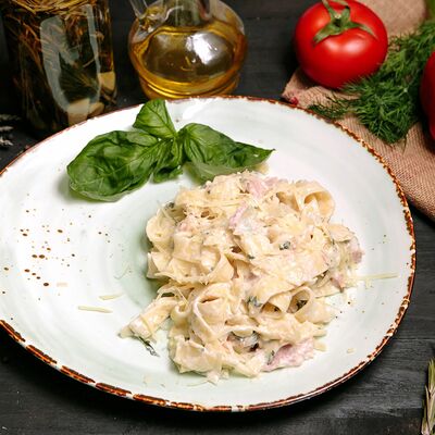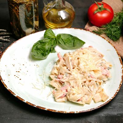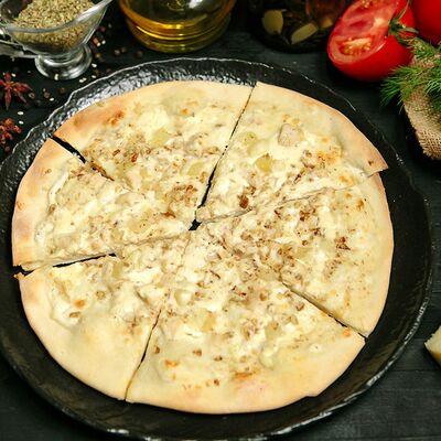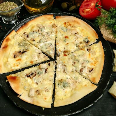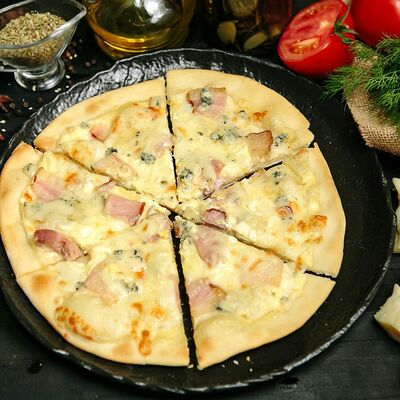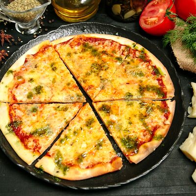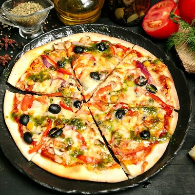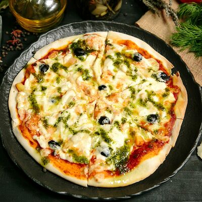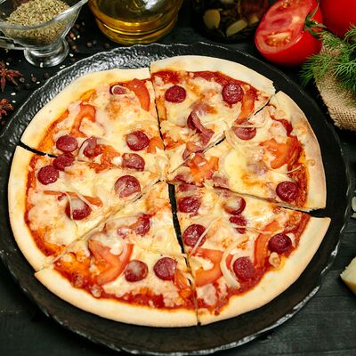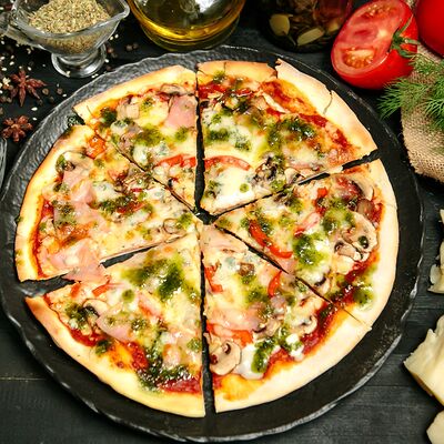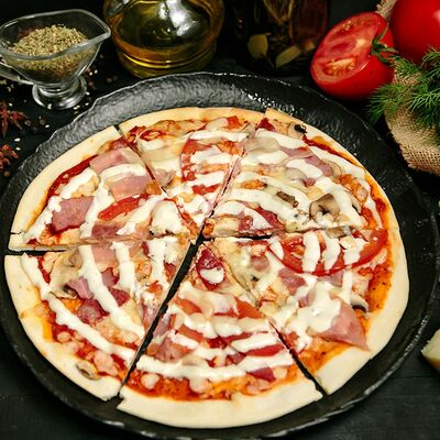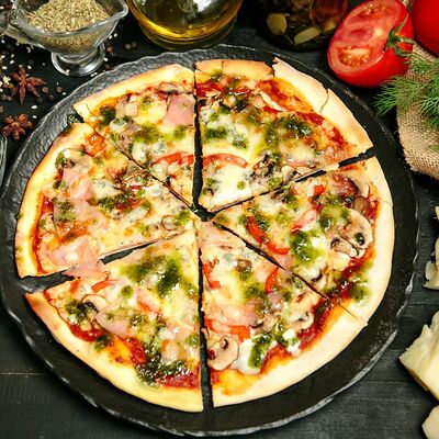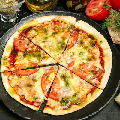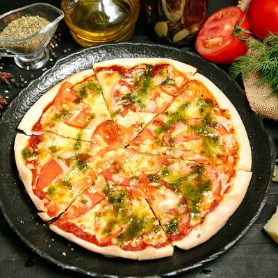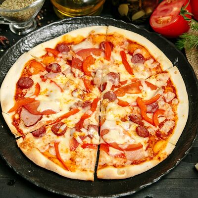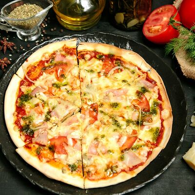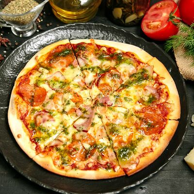 Итальянская пицца на тонком тесте. Соус для пиццы, сыр Моцарелла, окорок, салями, говядина по-европейски, бекон, томаты, базиликовый соус, орегано (30 см)