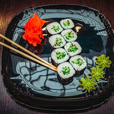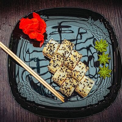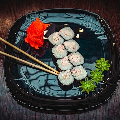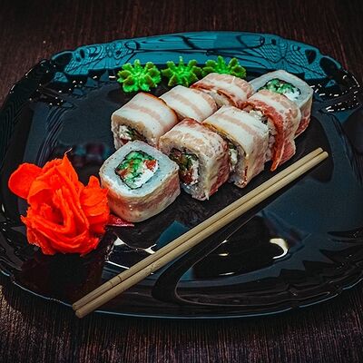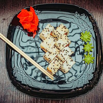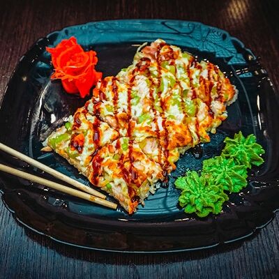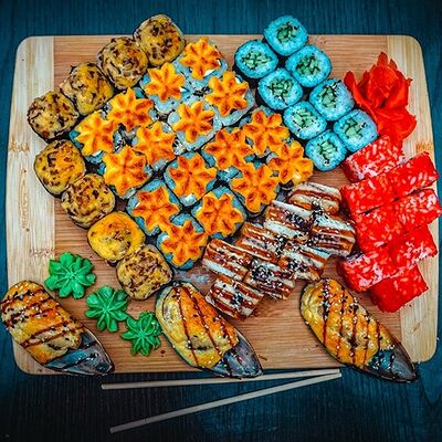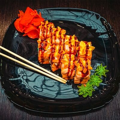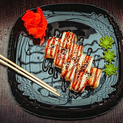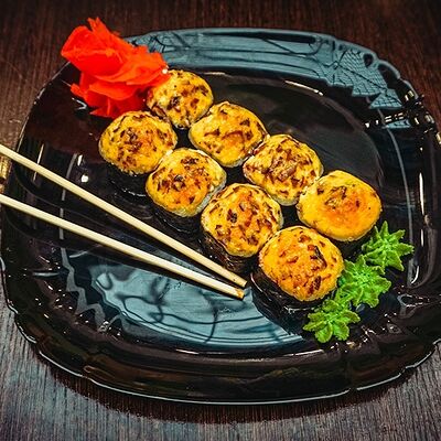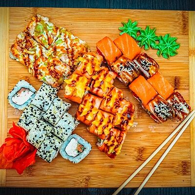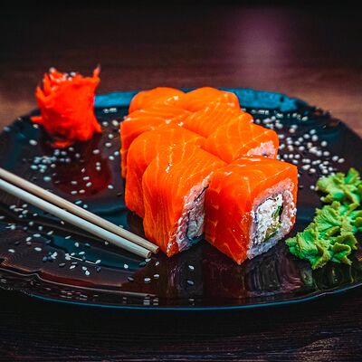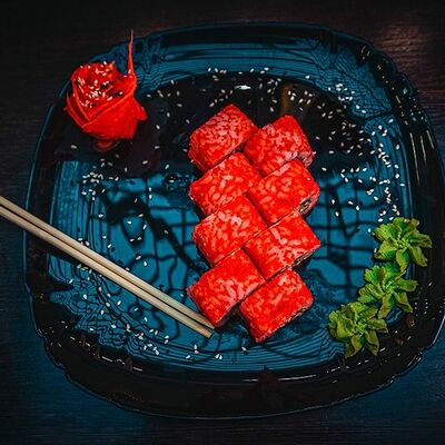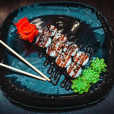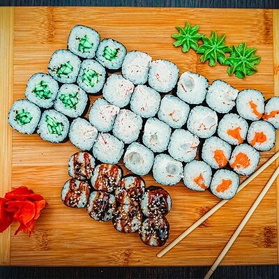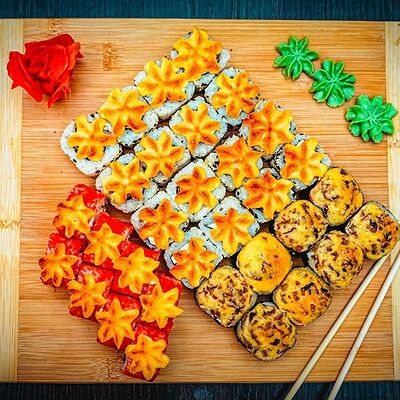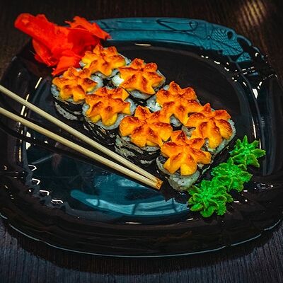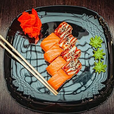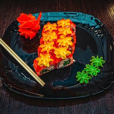 Рис, нори, сыр, масаго, угорь, лосось, соус д/з